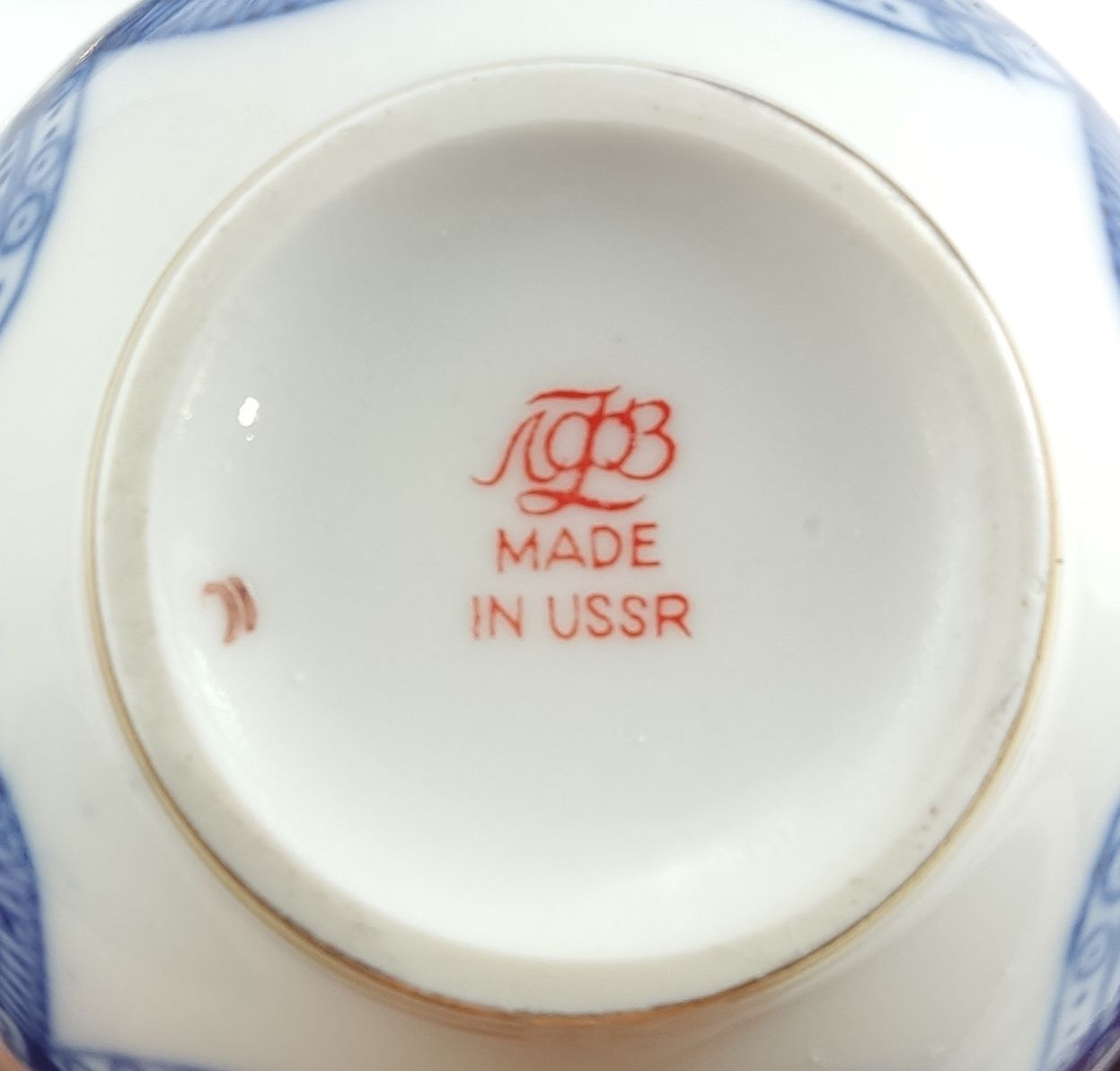 Мы предлагаем фарфоровый набор завтрака, созданный известным советским производством в области łомоносова во время СССР. Он состоит из чашки, блюдца и тарелки - целого украшения ритмичным узором в оттенках синего и темно -синего цвета с добавлением позолоченных деталей. Стиль узнаваемой и ценится фарфоровыми коллекционерами из Восточной Европы.
