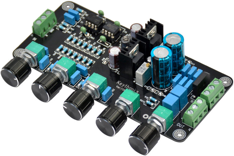 Высококачественный стереофонический предусилитель, предназначенный для регулировки тона, баланса и усиления перед блокировкой усилителя мощности. В предусилителе используются отдельные операционные усилители (операционные усилители) для левого и правого каналов. Операционные усилители размещаются в прецизионных гнездах корпуса DIP8, что позволяет легко вносить изменения путем замены интегральной схемы. В аудиотракте для левого канала использовался OPA2604AP, а в правом — AD827JN, чтобы пользователь (аудиофил) мог обнаружить различия при прослушивании. Дополнительно в комплект входит пара операционных усилителей JRC4558D и JRC5532D для модификации схемы предусилителя. В предусилителе реализована полная симметричная схема питания постоянного тока для питания операционных усилителей: она состоит из моста Грейца на входе, емкостного фильтра и линейных стабилизаторов положительного напряжения LM317 и отрицательного напряжения LM337. Линейные стабилизаторы имеют гораздо меньший собственный шум, чем импульсные конструкции (который иногда можно услышать невооруженным ухом). Емкостный фильтр оснащен высококачественными алюминиевыми электролитическими конденсаторами серии RX30 производства Rubycon. Предварительный усилитель оснащен пятью отдельными потенциометрами с ручками с маркировкой от W1 до W5, которые используются для регулировки: низких тонов (басов), средних тонов, высоких тонов (высоких частот), баланса между левым и правым каналами и регулировки усиления. Входные и выходные сигналы подаются по кабелям, которые следует прикрутить к разъемам клеммной колодки на печатной плате предусилителя. Мы рекомендуем использовать экранированный аудиокабель. Вся система профессионально собрана на качественной печатной плате с металлизированными отверстиями.