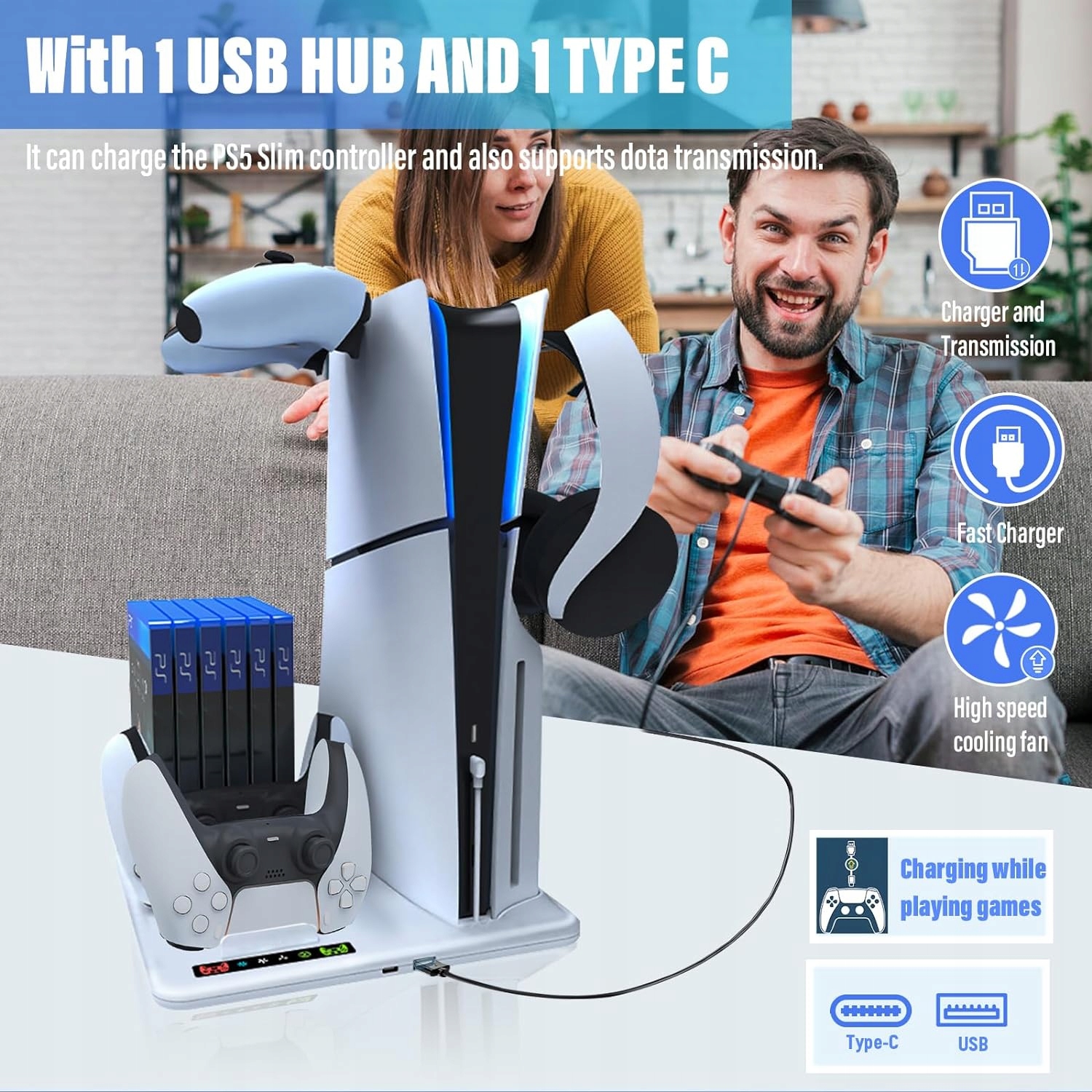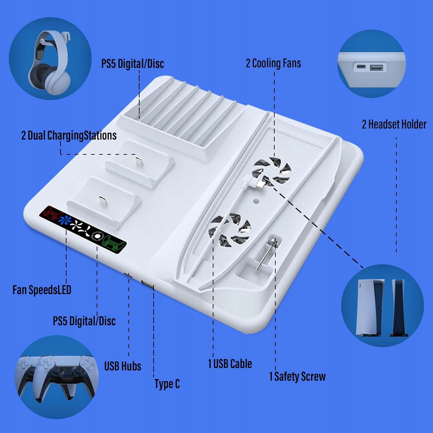 【Многофункциональная вертикальная подставка】 Конструкция 5-в-1 для консолей PS Dualsense и PS5 Slim. В комплект входит охлаждающий вентилятор, 2 разъема для зарядки консоли PS5 + 1 отделение для картриджей + 2 вешалки для хранения + 1 выходной порт USB (2,8 А – 5,28 В) + 1 выходной порт Type-C + винт для монет. В вашем распоряжении централизованное хранилище.