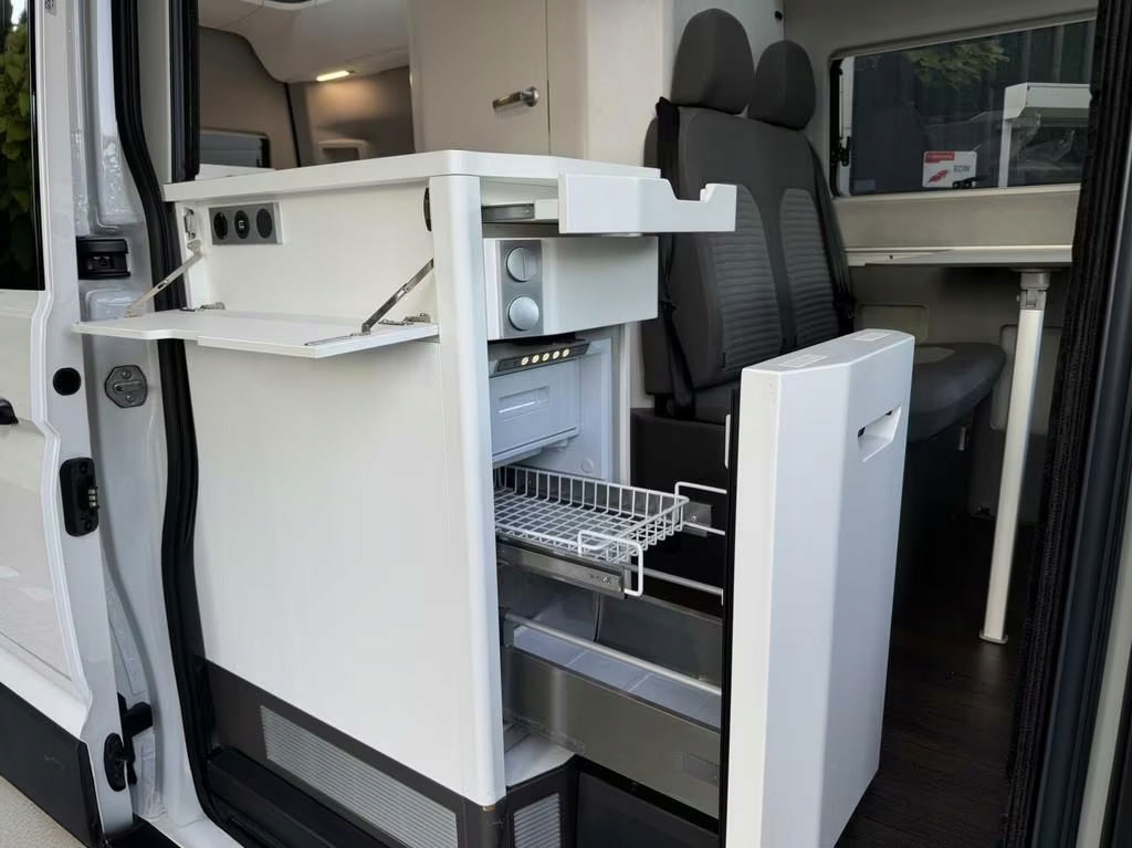Твердое корпус и высококачественные материалы гарантируют долговечность и сопротивление изменяющимся дорожным и погодным условиям. Холодильник прекрасно интегрируется с внутренней частью VW Crafter California, обеспечивая функциональность и в соответствии со стандартами Volkswagen.