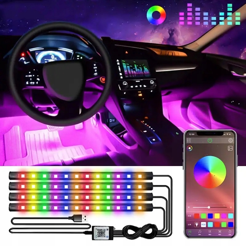 Внутреннее освещение автомобильной кабины светодиодного приложения RGB 4x12 Bluetooth. Приложение USB