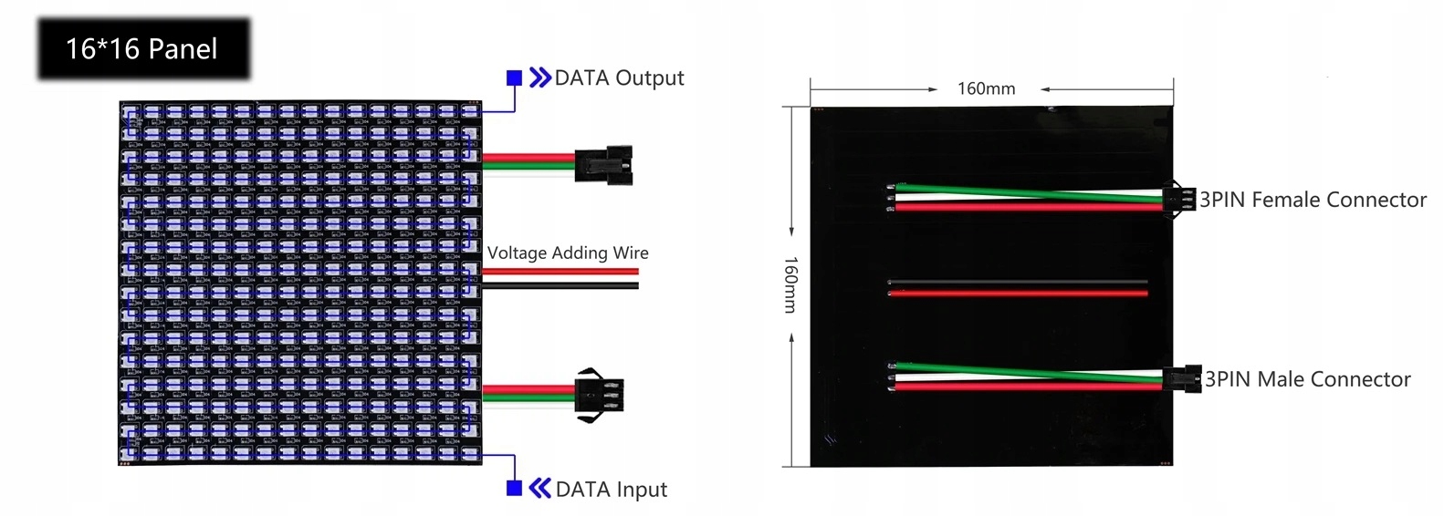 - Модель: WS2812B, пиксельный экран, размер: 16×16×0,2 см( Д×Ш×В), рабочее напряжение: 5 В постоянного тока, мощность: 0,3 Вт/светодиод. Каждый светодиод адресуется индивидуально. Каждый светодиод можно расположить так, как вы хотите, чтобы просматривать сообщения или рисовать небольшие картинки.