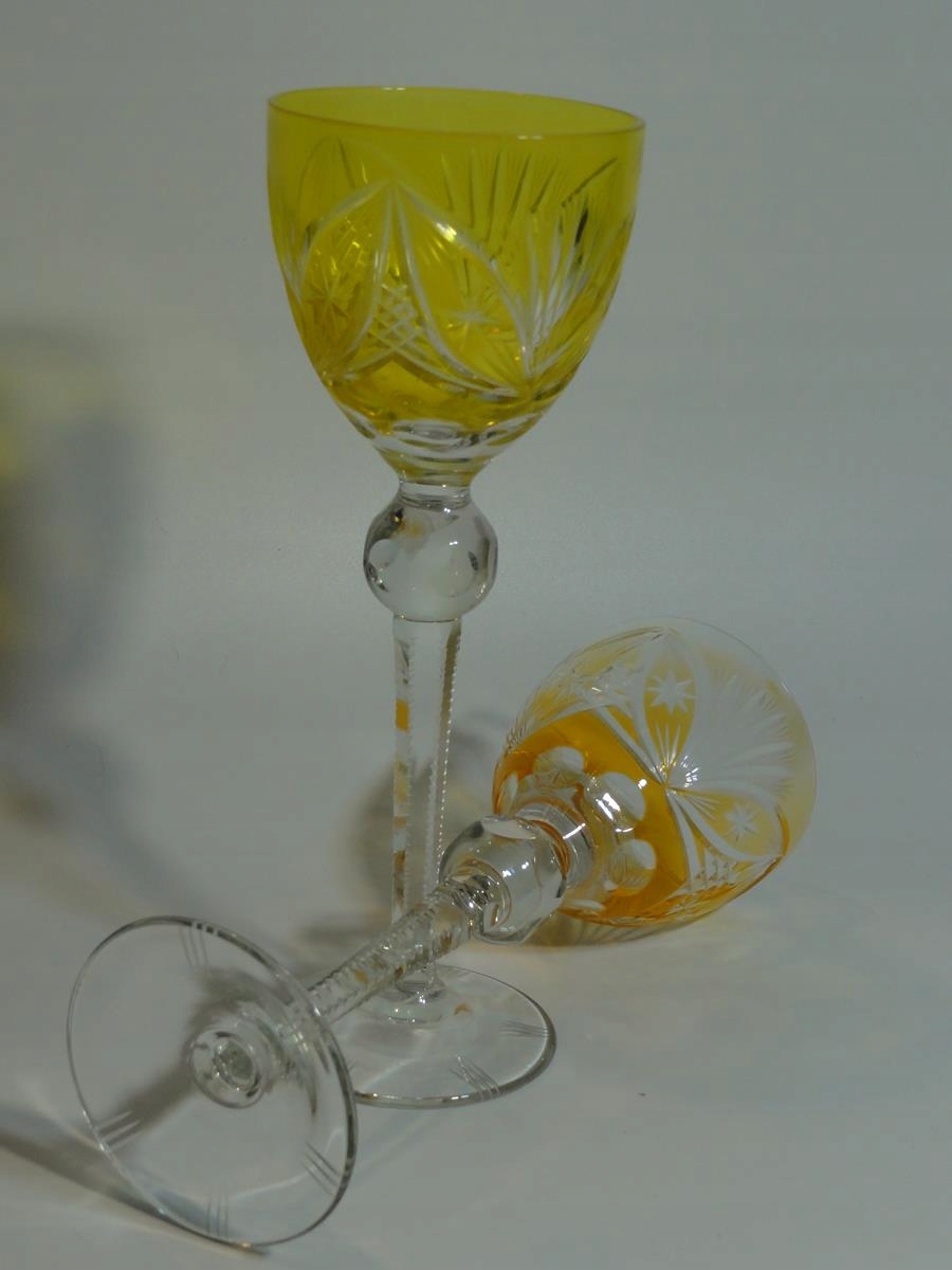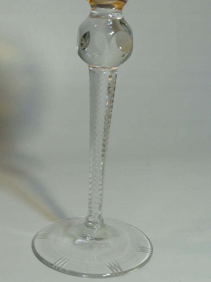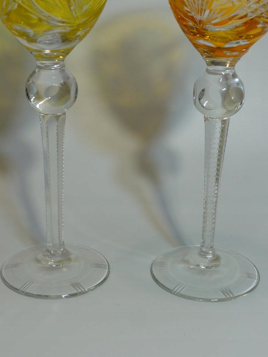*бокалы из свинцового стекла, выдутого в форме, шлифованного и полированного, оранжевое и желтое покрытие, столбчатое древко, рифленые края, шлифованное основание,