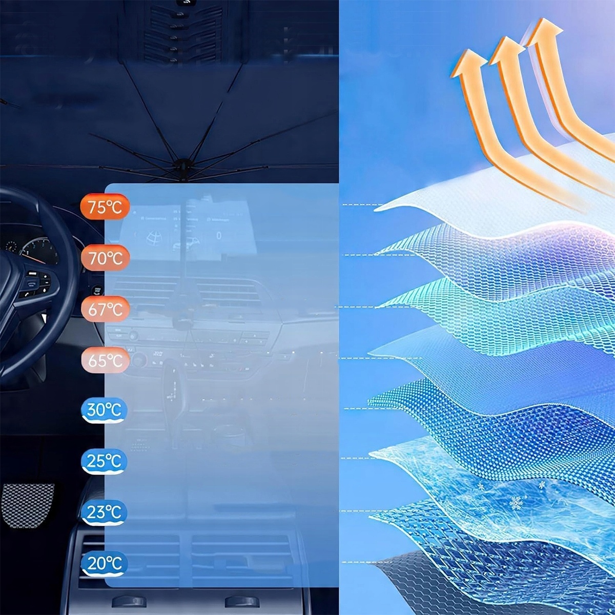 - 【Усовершенствованная защита от солнца и тепла】】 благодаря нанотке с кристаллами льда и отражающим композитным материалам UPF 50+, этот солнцезащитный крем для автомобиля эффективно блокирует четыре тепловых источника: ультрафиолетовые лучи, инфракрасные лучи, солнечный спектр и тепловое излучение. Он защищает сиденья и приборную панель от трещин под воздействием солнечного света, а также обеспечивает интимную атмосферу в интерьере.