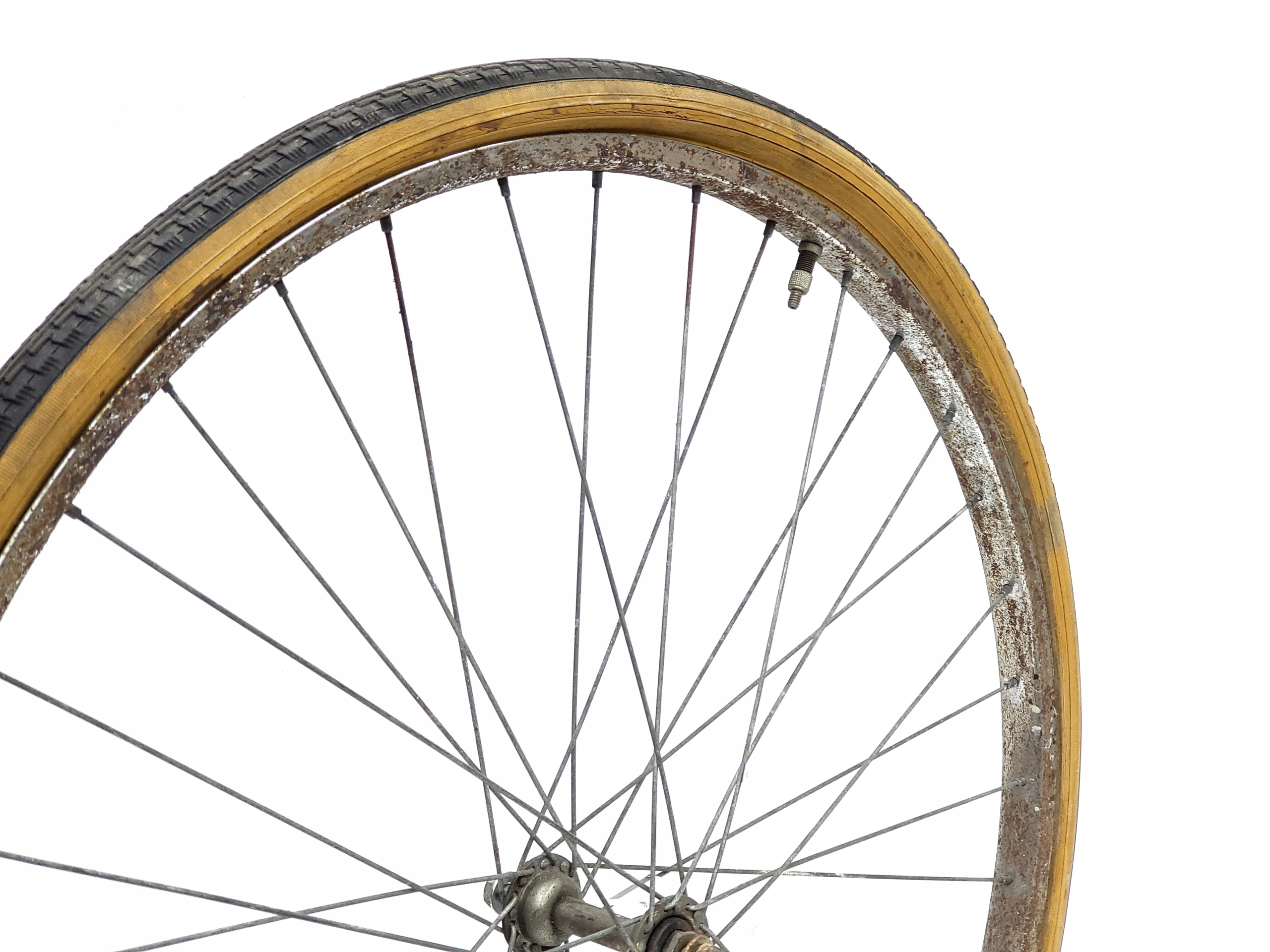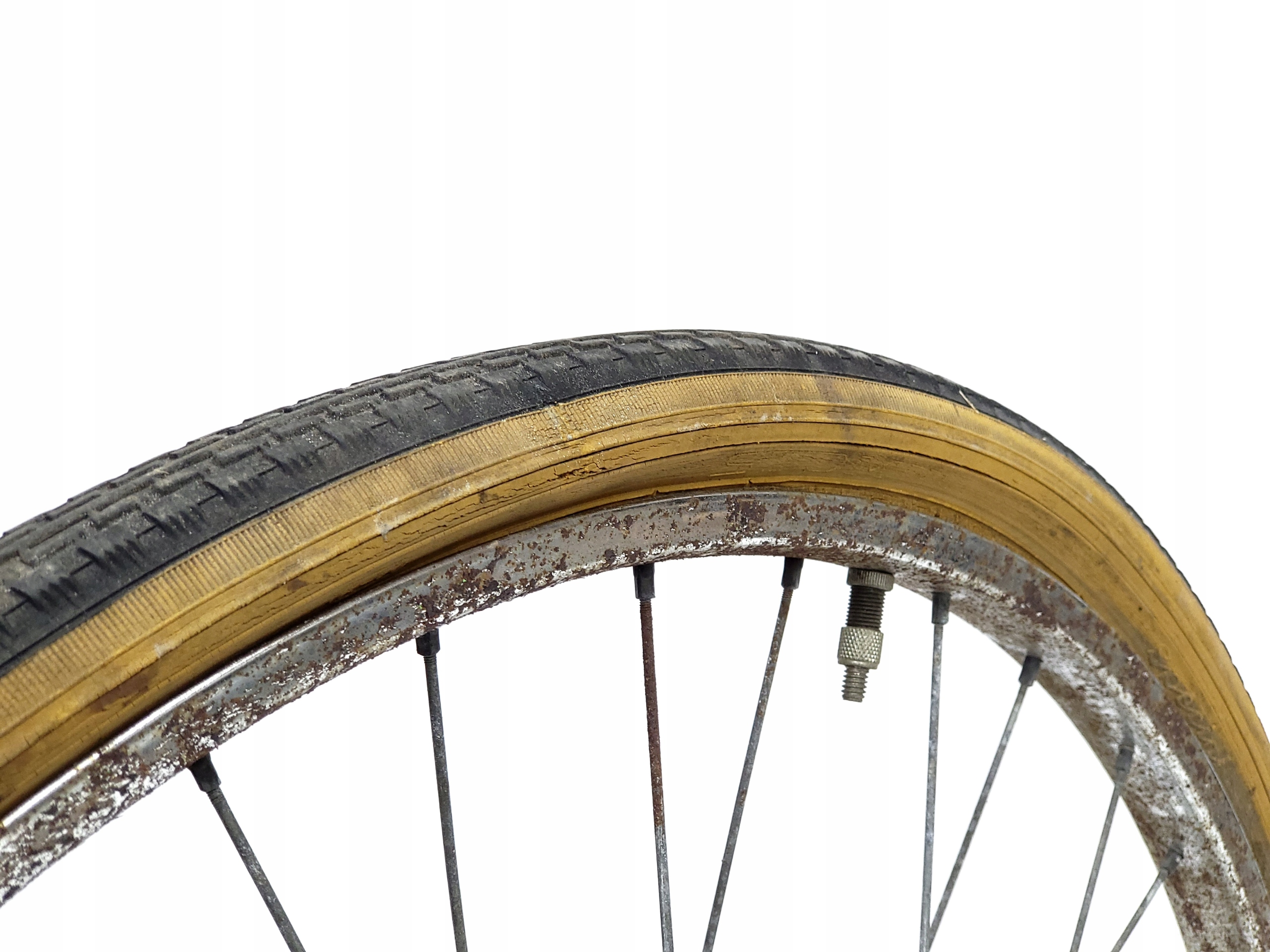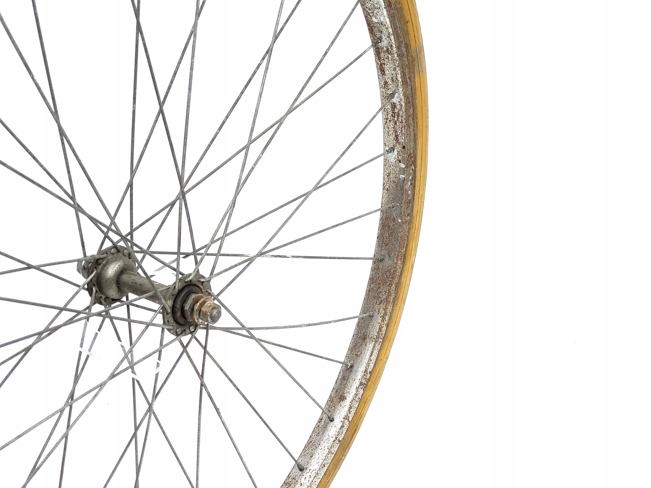 переднее колесо 26x1 3/8 дюймов (внешний диаметр обода: 60,5 см) для экспортных велосипедов Romet Universal Tyler и аналогичных моделей с годов PRL. Обод прост, с высокой коррозией, концентратор функционирует с минимальным свободным, чтобы удалить, разлетевшуюся шину, внутреннюю трубку. h1>