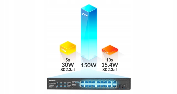 30w - Поддерживаемые стандарты POE: 802.3af, 802.3at