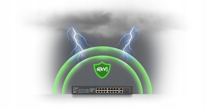 Сам переключатель и подключенные к нему устройства неоднократно подвергаются воздействию различных угроз, включая текущие разряды, которые могут проходить как через мощность, так и сетевые кабели. Защитная система от разряда, гарантируя защиту на 6 кВ для всех портов, эффективно уменьшая их ущерб из -за резкого увеличения напряжения.