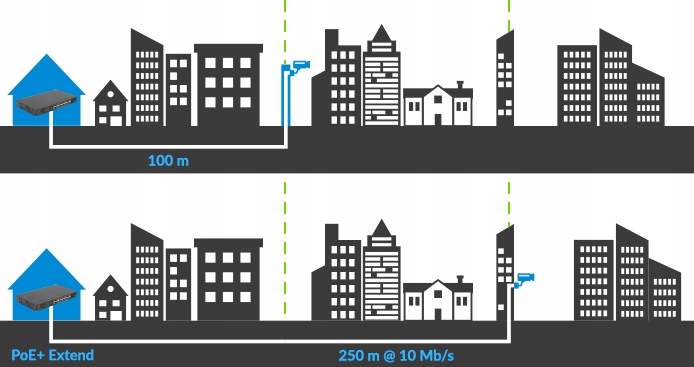 Стандартные переключатели в соответствии со стандартом Убедитесь, что рабочие устройства до 100 м на одной секции кабеля. Тем не менее, иногда оказывается, что из -за обширной скелетной сети и сложной среды требуется нестандартное решение при разработке кабеля и сети, которая выходит за рамки стандарта. В случае мониторинга решений это довольно распространенная проблема, чаще всего возникающая в результате слишком большого расстояния между распределительным устройством и конечным устройством.