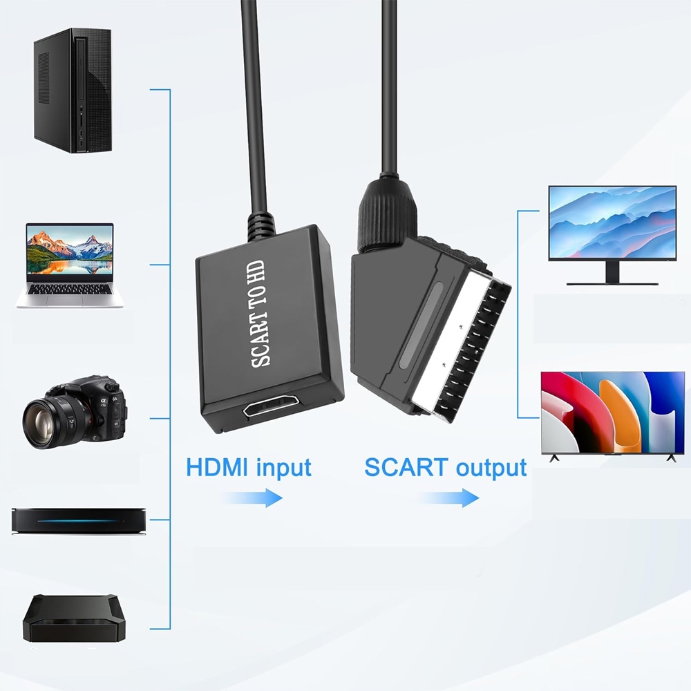 Преобразует вход аналогового шкафы в вывод HDMI 720p/1080p (60 Гц), обеспечивая более реалистичный HD -изображение. Для сигналов Scart для воспроизведения на HDTV, монитор или проектор с входами HDMI, но без Scart. (Примечание: не поддерживает HDMI в Scart!)