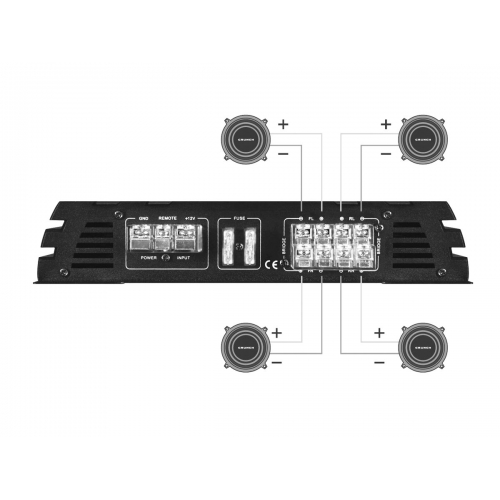Используется для питания одной пары динамиков и сабвуфера. Отдельные кроссоверы для каналов 1-2 и 3-4 позволяют идеально настроить параметры звука для пары колонок и сабвуфера с мостовым питанием. Один усилитель питает всю аудиосистему.