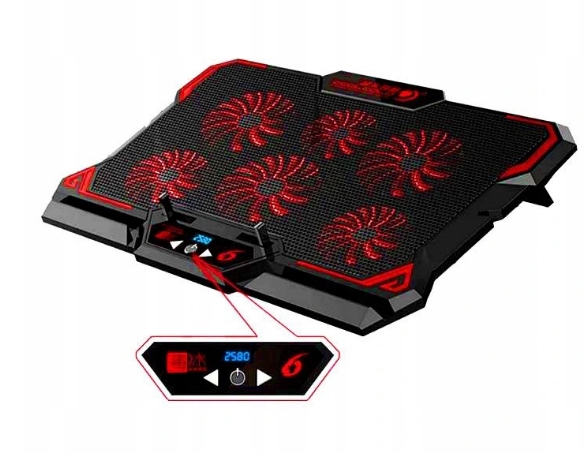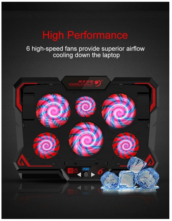 - Охлаждающая подставка отличается эффективным охлаждением благодаря использованию 6 вентиляторов с подсветкой, которые распределяют тепло равномерно, охлаждают ноутбук по всей поверхности подставки.