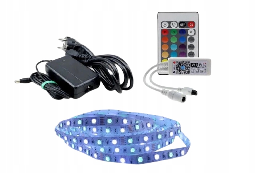 - В комплект входит: Лента RGBW длиной 2 м, настольный блок питания, WiFi-контроллер RGBW, пульт дистанционного управления на 24 клавиши, 3 разъема.