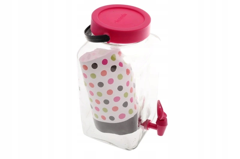 - Стеклянный контейнер с пластиковой крышкой и пластиковым краном очень популярен для подачи фруктовых соков, лимонада и других напитков для различных случаев.