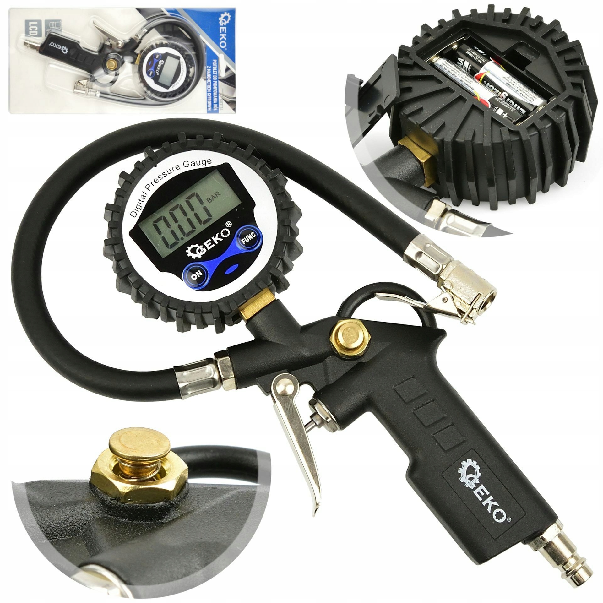 Пистолет высокого качества для накачки колес со стандартными вентиляторами автомобиля. Манометр был защищен профилированной резиной, защищая его от повреждения во время использования. Инструмент оснащен стандартной мужской быстрой связью, используемой в европейских пневматических инструментах. Цифровое датчик давления обеспечивает точные значения.