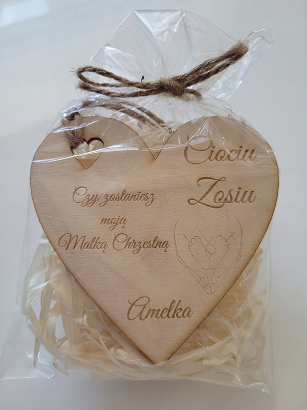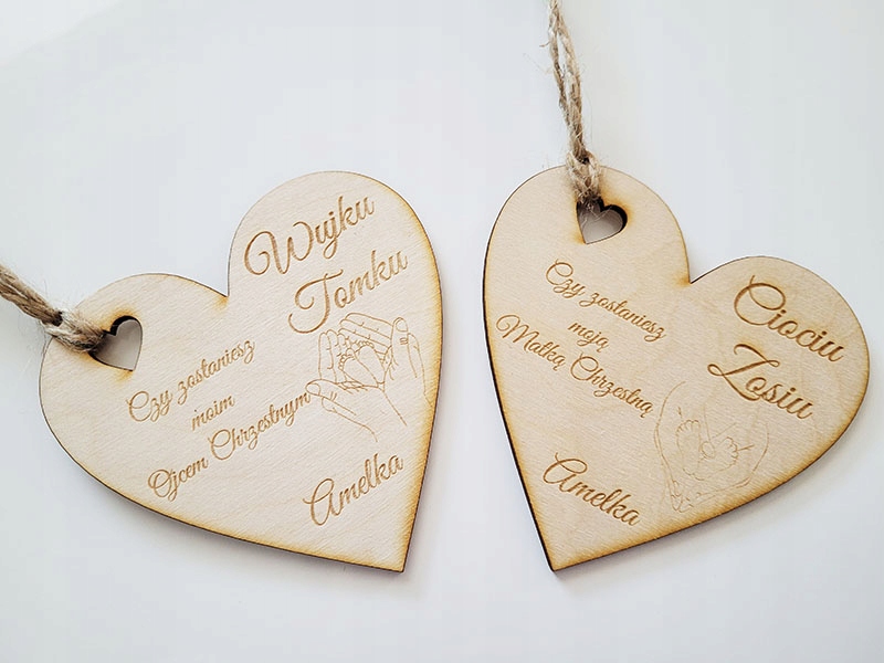 Красивые деревянные подвески-сердечки для подарка будущим крестным родителям с вопросом ребенка. Просьба тете и дяде упакована в стильную сумку с древесной ватой и бантиком из джутовой веревки. Оригинальная форма расспроса о крестных станет отличным сувениром на будущее. Деревянный кулон украшен точной индивидуальной гравировкой и джутовым бантиком. Изящный набор из двух подвесок для обоих крестных.