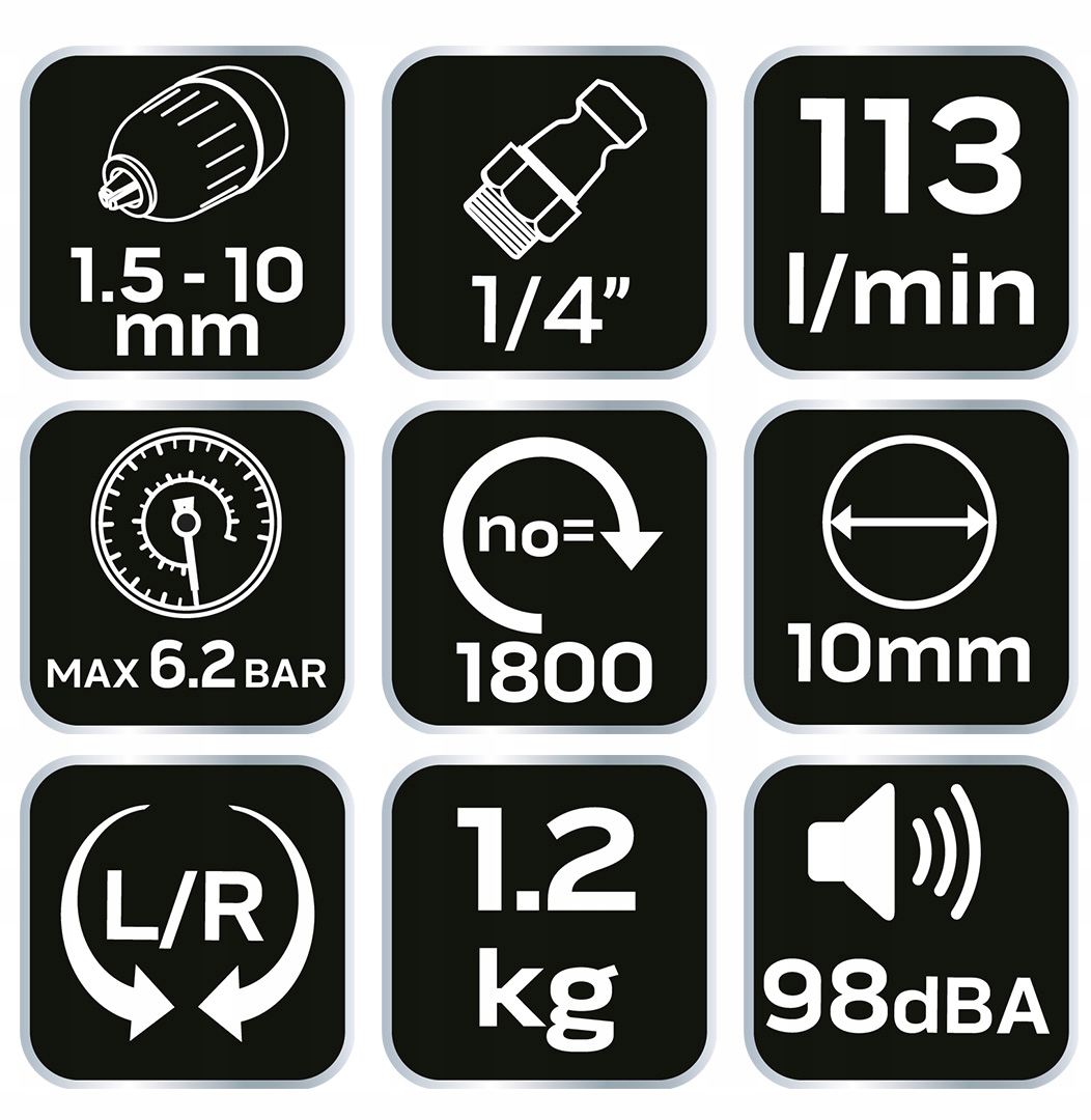 Нео пневматическая тренировка (ссылка. 14-026). Нео -пневматическая тренировка характеризуется высоким качеством. Идеально подходит для работы мастерской. Максимальный диаметр 10 мм. Он имеет правый/левый переключатель вращения, максимальный оборот 1800 об/мин, рабочее давление 6.3 - 7,0 бар. Соответствие европейским стандартам безопасности обеспечивается сертификатом CE. Бренд NEO соответствует ожиданиям профессионалов.