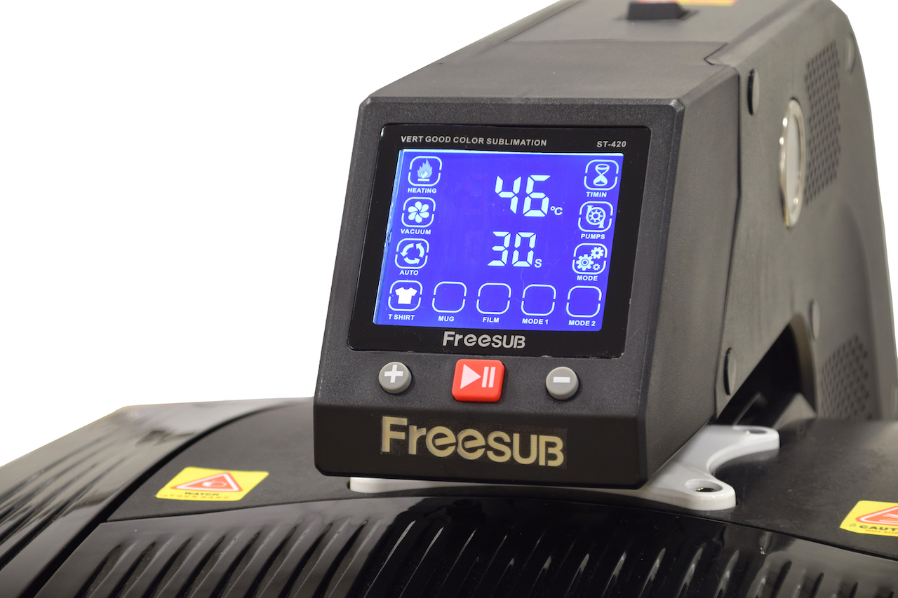 Это устройство из "верхней" полки производителей прессов - отличается полной автоматизацией - устройство открывается и закрывается само и создает в камере вакуум (в пресс встроен компрессор), благодаря чему мы можем создавать отпечатки одновременно на объектах различной формы.