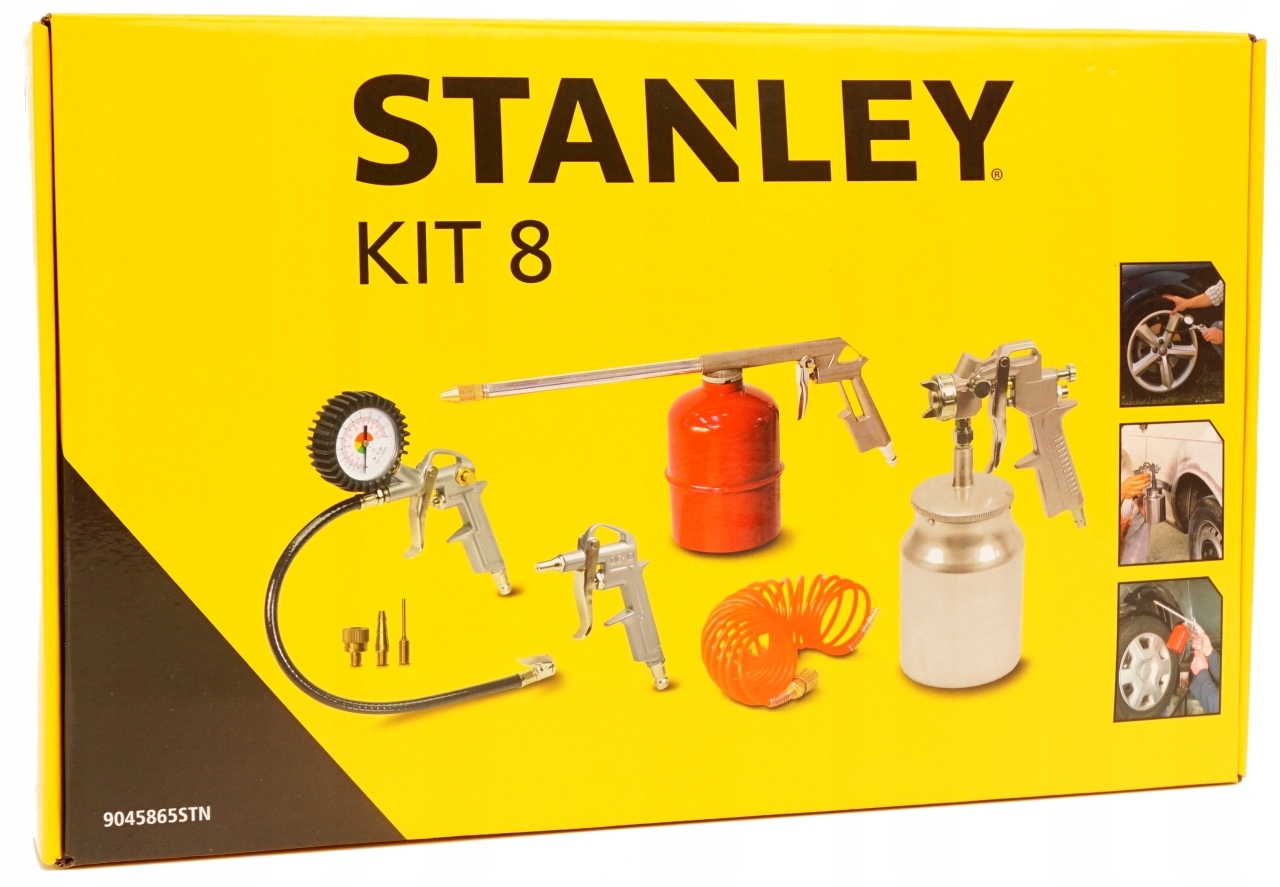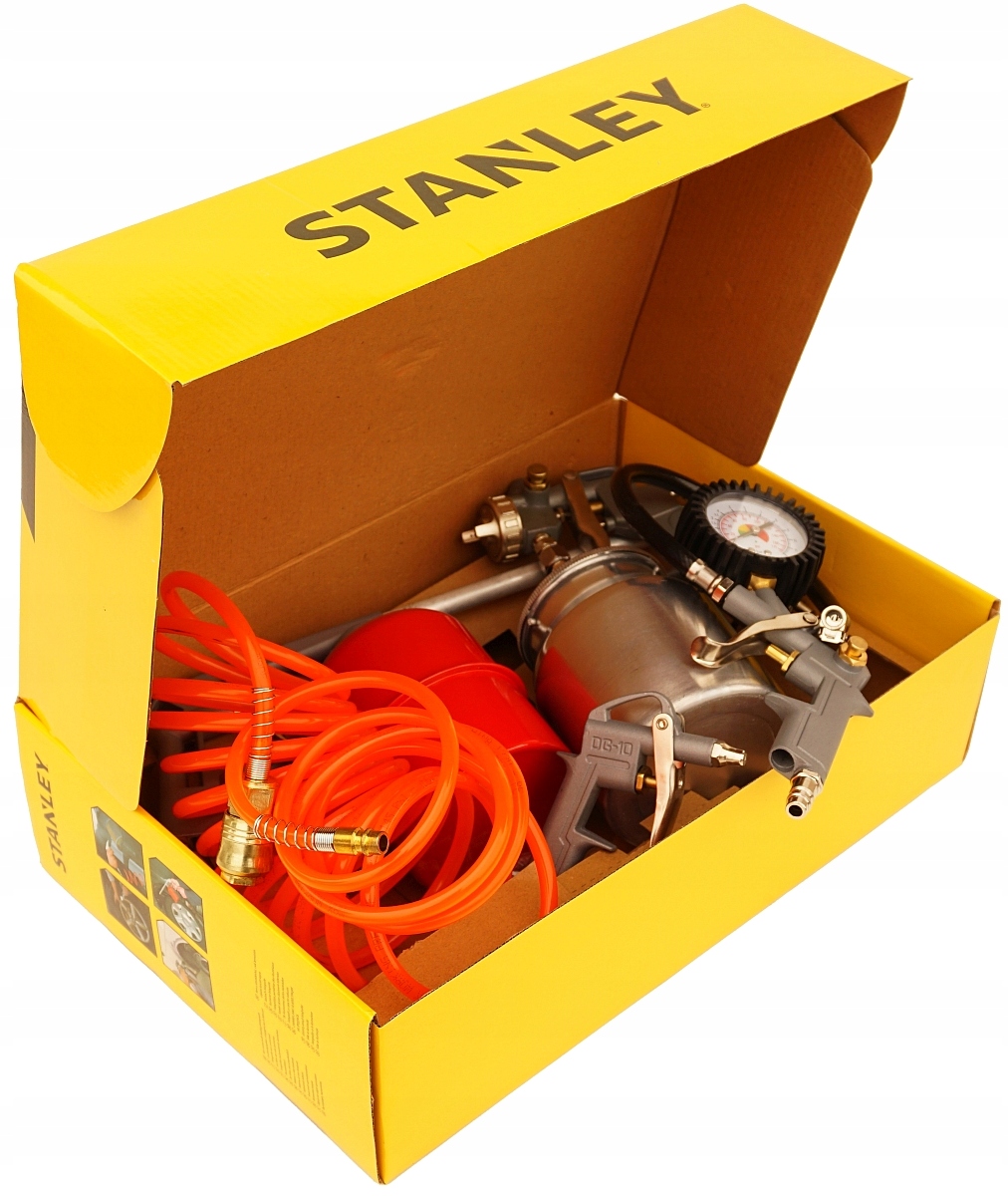 - Набор оригинальных инструментов STANLEY KIT 8 (пистолет для накачивания, пистолет для обдува, пистолет для окраски/лакировки с нижним бачком, пистолет для смазки/промывки, 5 шт.) метровый спиральный шланг, набор из 3 насадок)