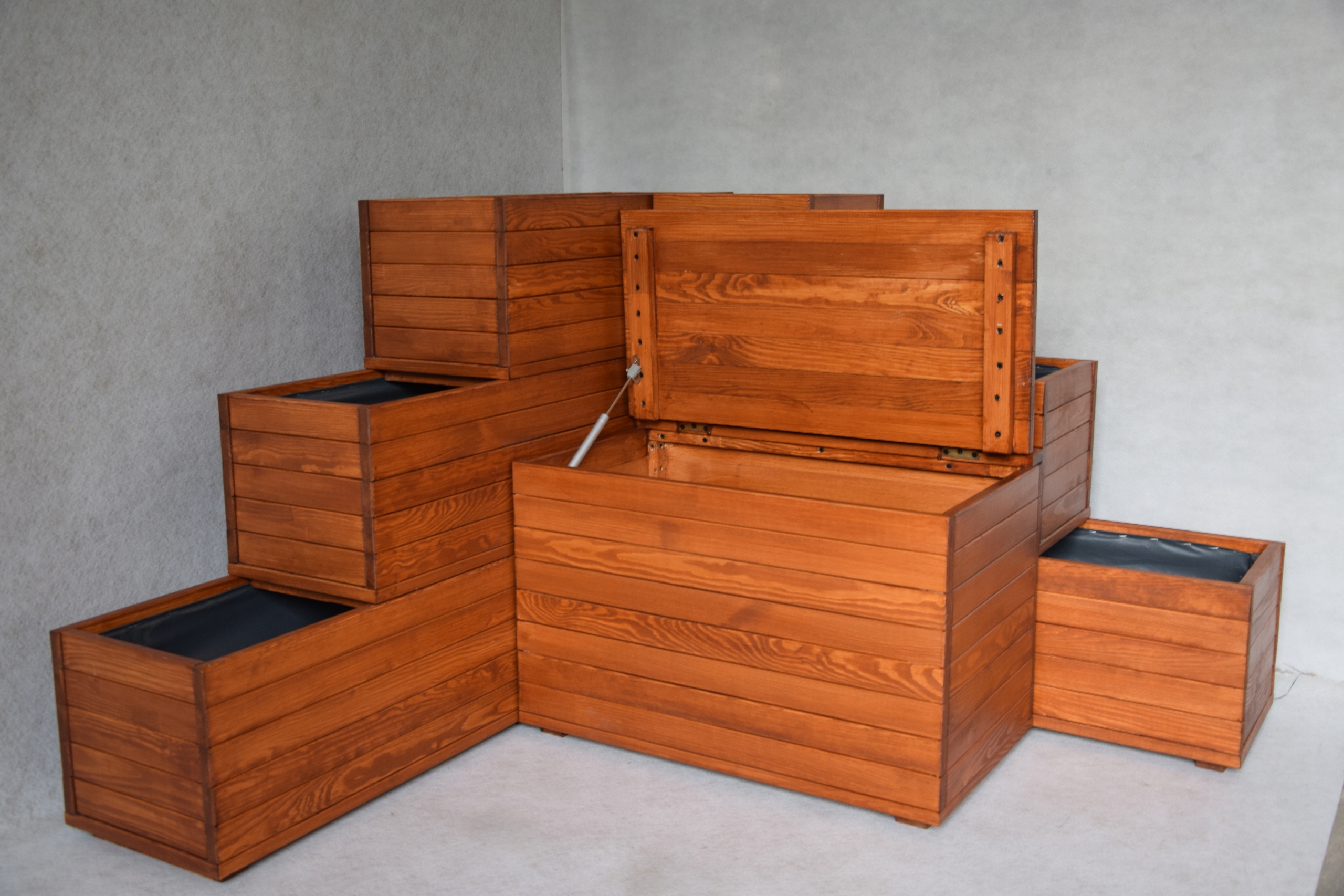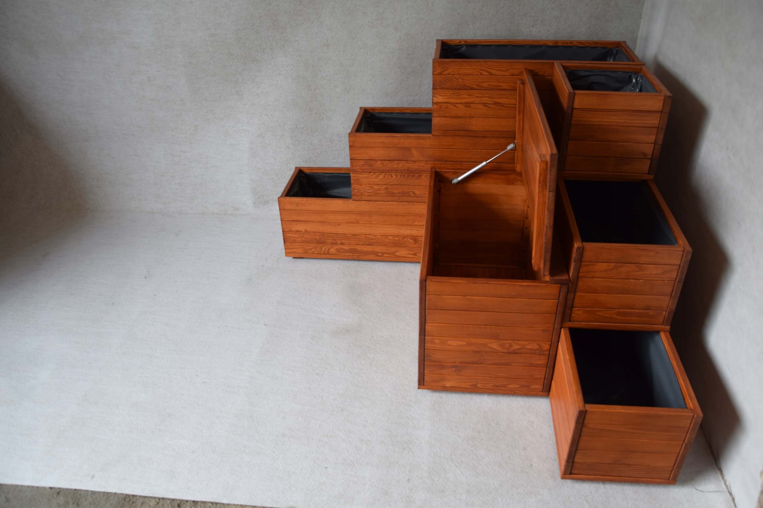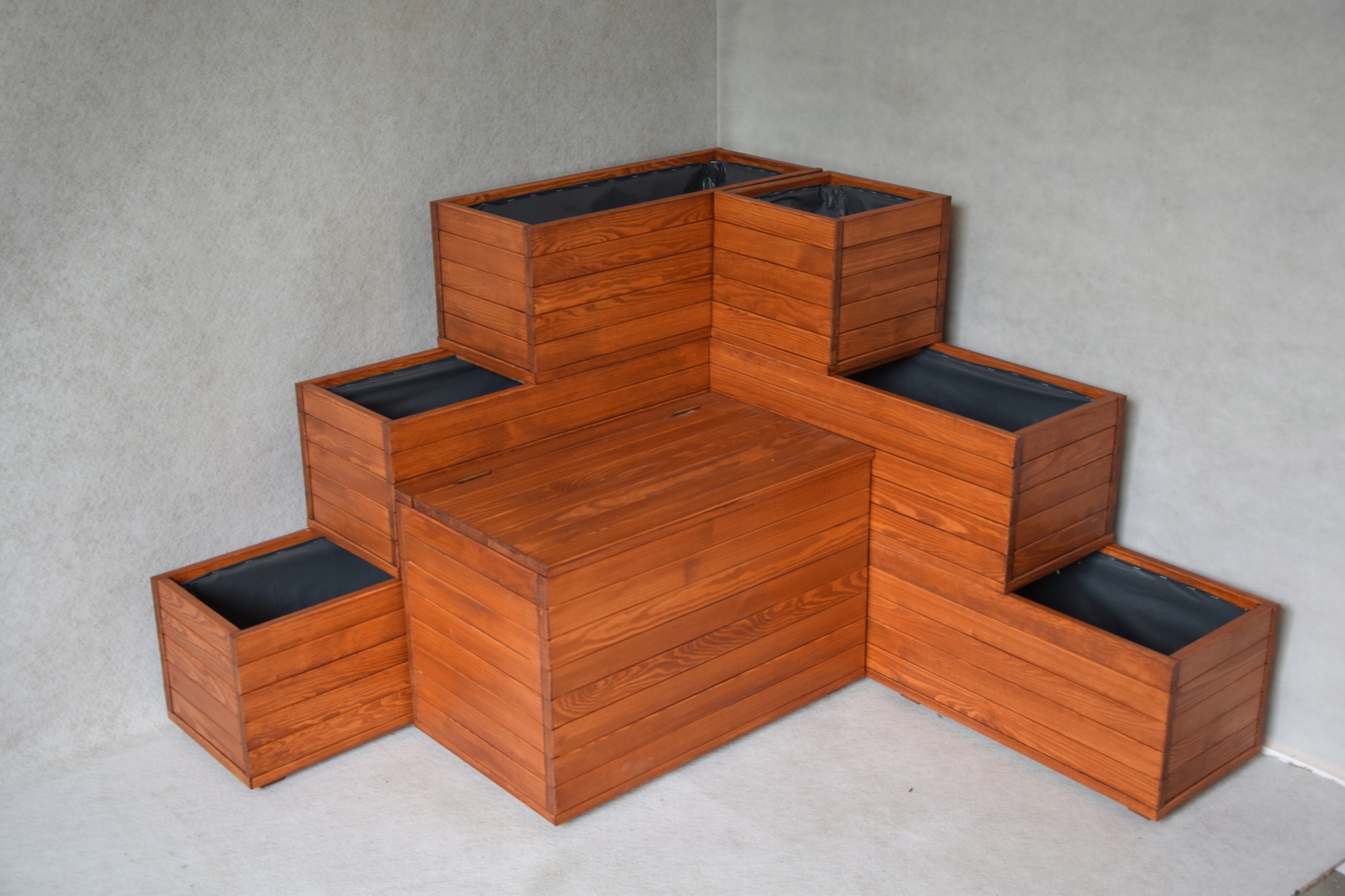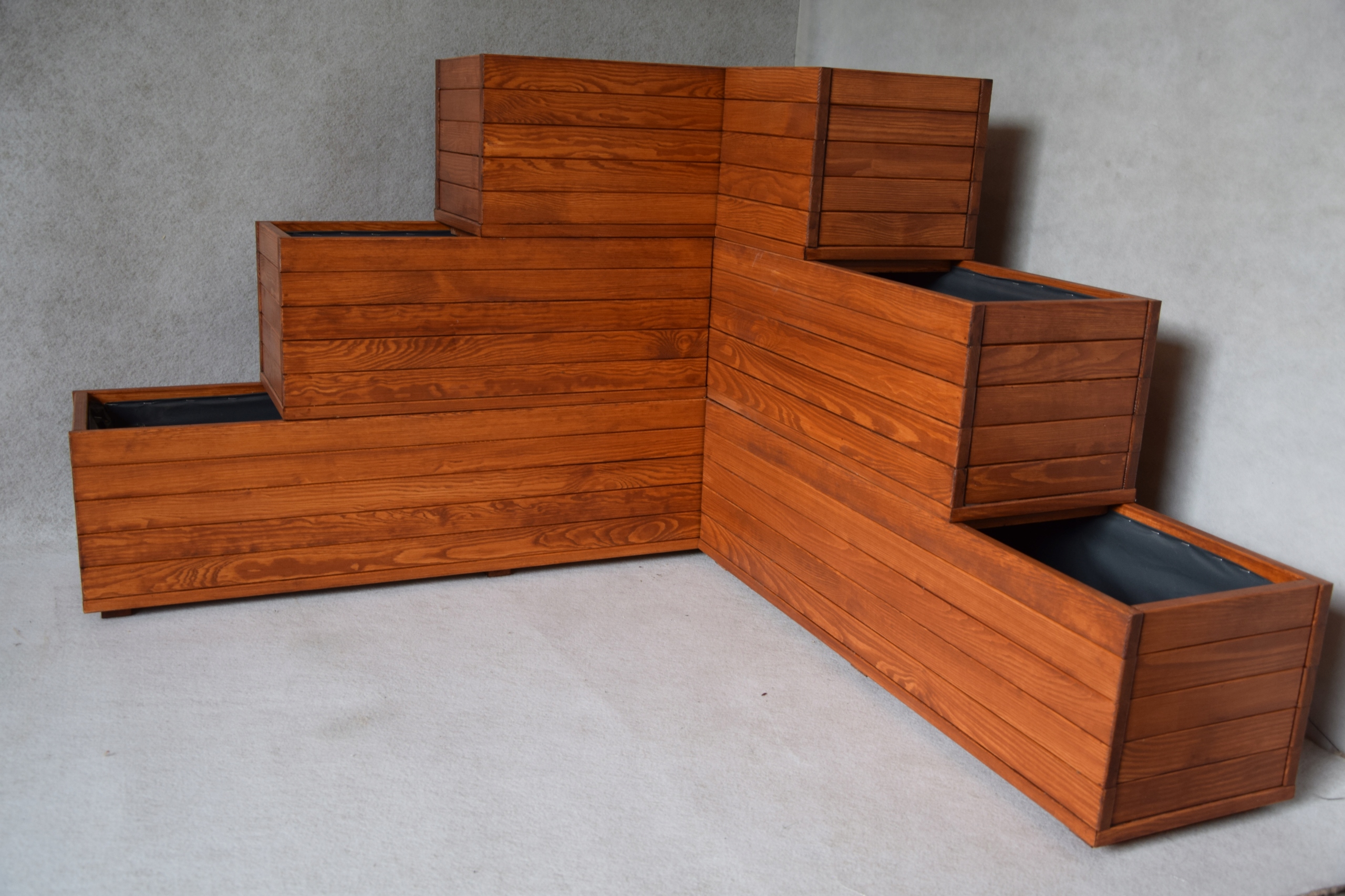 Набор включает в себя 6 горшок, которые образуют угол с размерами 130 x 130 и 90 см высотой (ширина каждого горшка 30 см) и деревянная коробка, размером 70 x 40 x 45.
