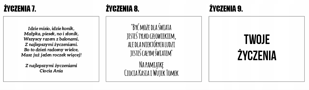 Не забудьте отправить нам текст точно так же, как он должен быть выгравирован. Всегда изменяйте имена и тексты в правильном номере (одиночное или множественное число). Имена пишите с заглавным письмом, например, Касия, Агниша и т. Д. Также не забывают, чтобы польские персонажи в стихотворении и именах (ą, ę, и т. Д.) Используйте пунктуацию (точки, запятые и т. Д.) В местах, где это должно быть применено. текст.