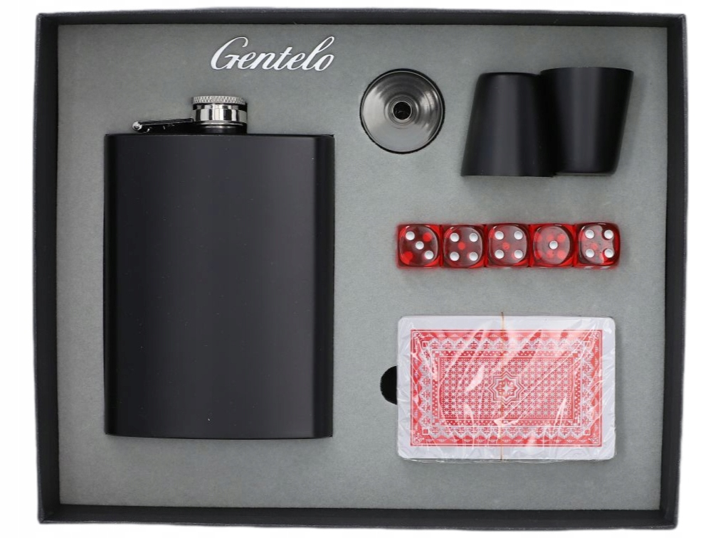 Подарочный набор, состоящий из фляжки на 8 унций (приблизительно 240 мл), двух стаканов, воронки, игральных костей и колоды карт. Все упаковано в элегантную коробку.