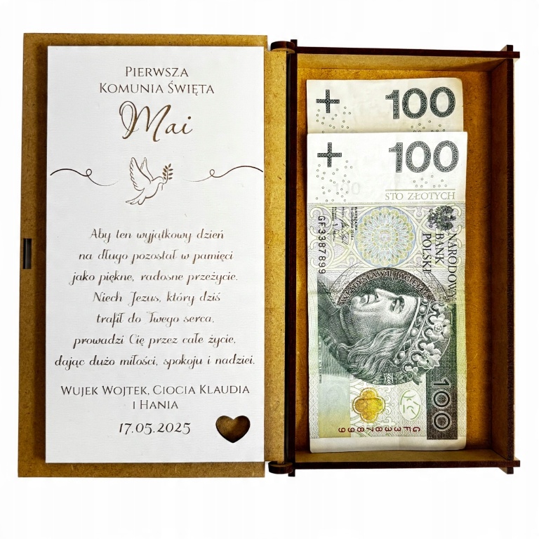Сделайте уникальный подарок, который останется с вашим ребенком на протяжении многих лет! Наш деревянный сувенир первого святого причастия - это не только элегантный способ дать деньги, но и личный дар, полный символизма и эмоций.
