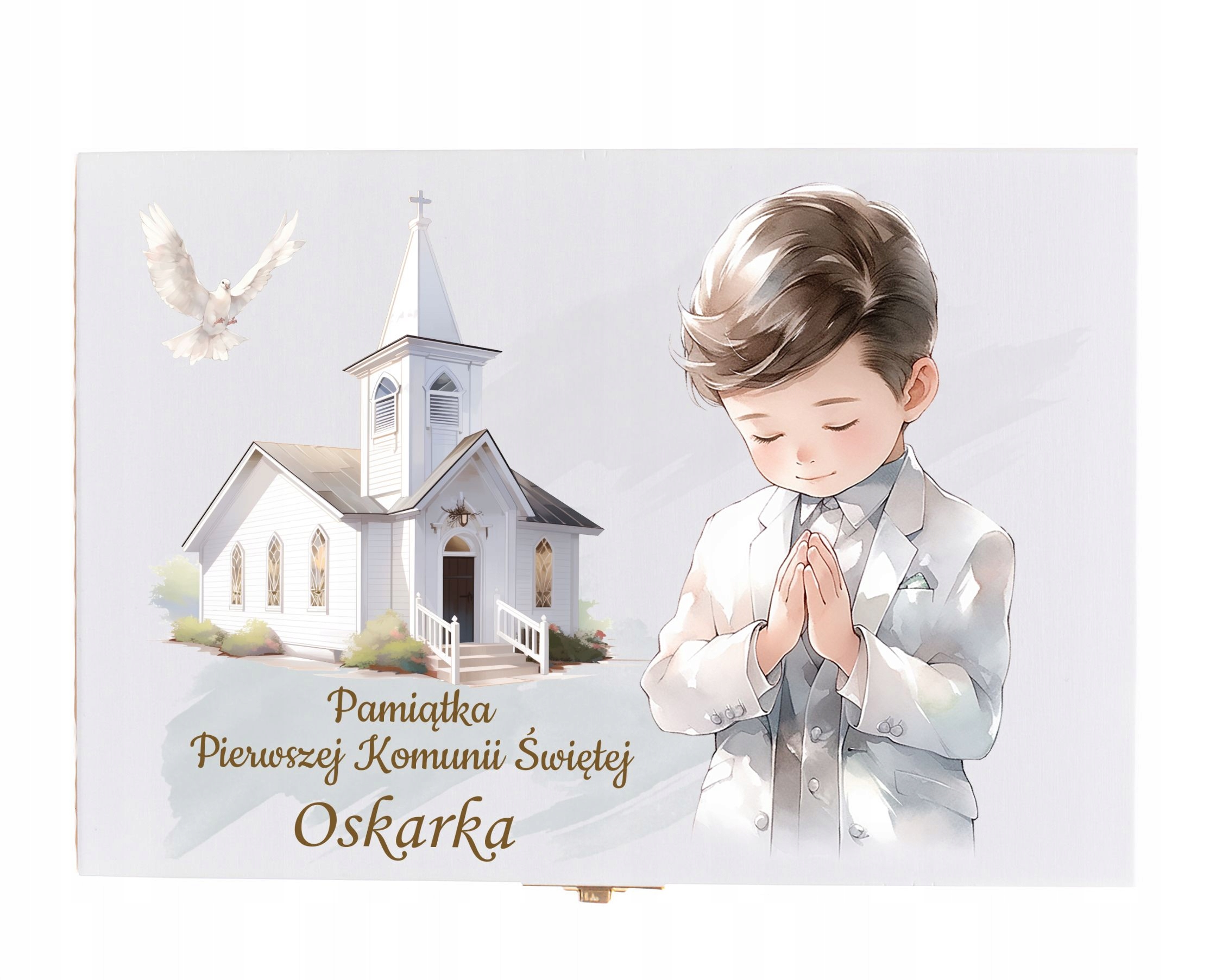 На аукционе ниже мы представляем вам деревянную подарочную коробку для первого святого причастия. Экологические материалы и красивый печатный мотив дают климат и характер. Внутри мы будем надеть банкноты и другие небольшие подарки. Такой подарок сочетает в себе красоту естественного материала с деликатесной и чистотой, которые так часто связаны с этим таинством.