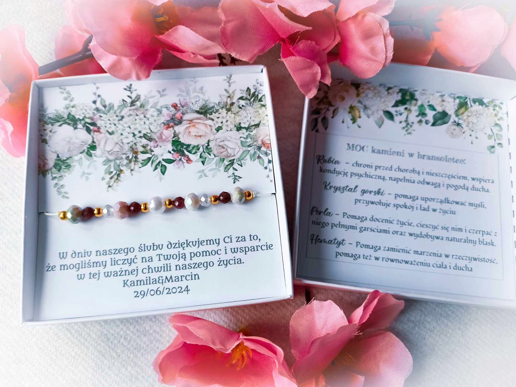Каждый браслет упакован в декоративную белую коробку, отделанную белым луком с персонализированной картой в различных дизайнах на выбор.