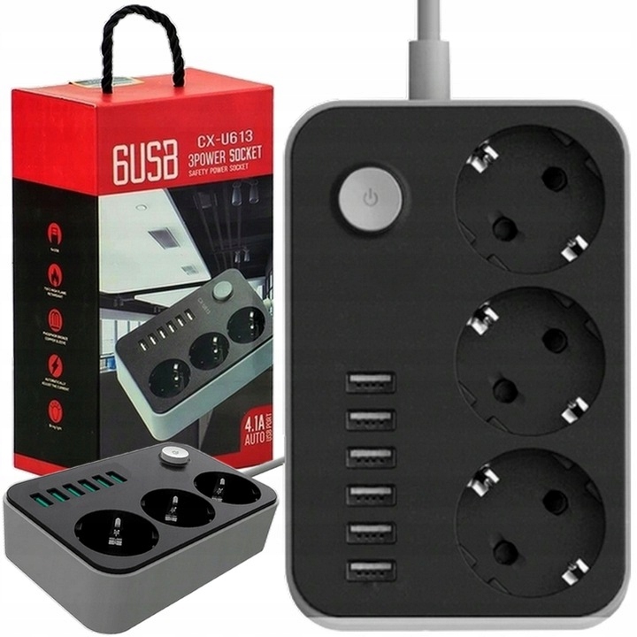 Удлинитель — удлинитель и мощное зарядное устройство в одном. Удлинитель имеет 6 портов USB и 3 розетки с заземлением, что позволяет одновременно подключать до 9 различных устройств. Кроме того, полоска имеет практичный выключатель питания и светодиодную индикацию работы.