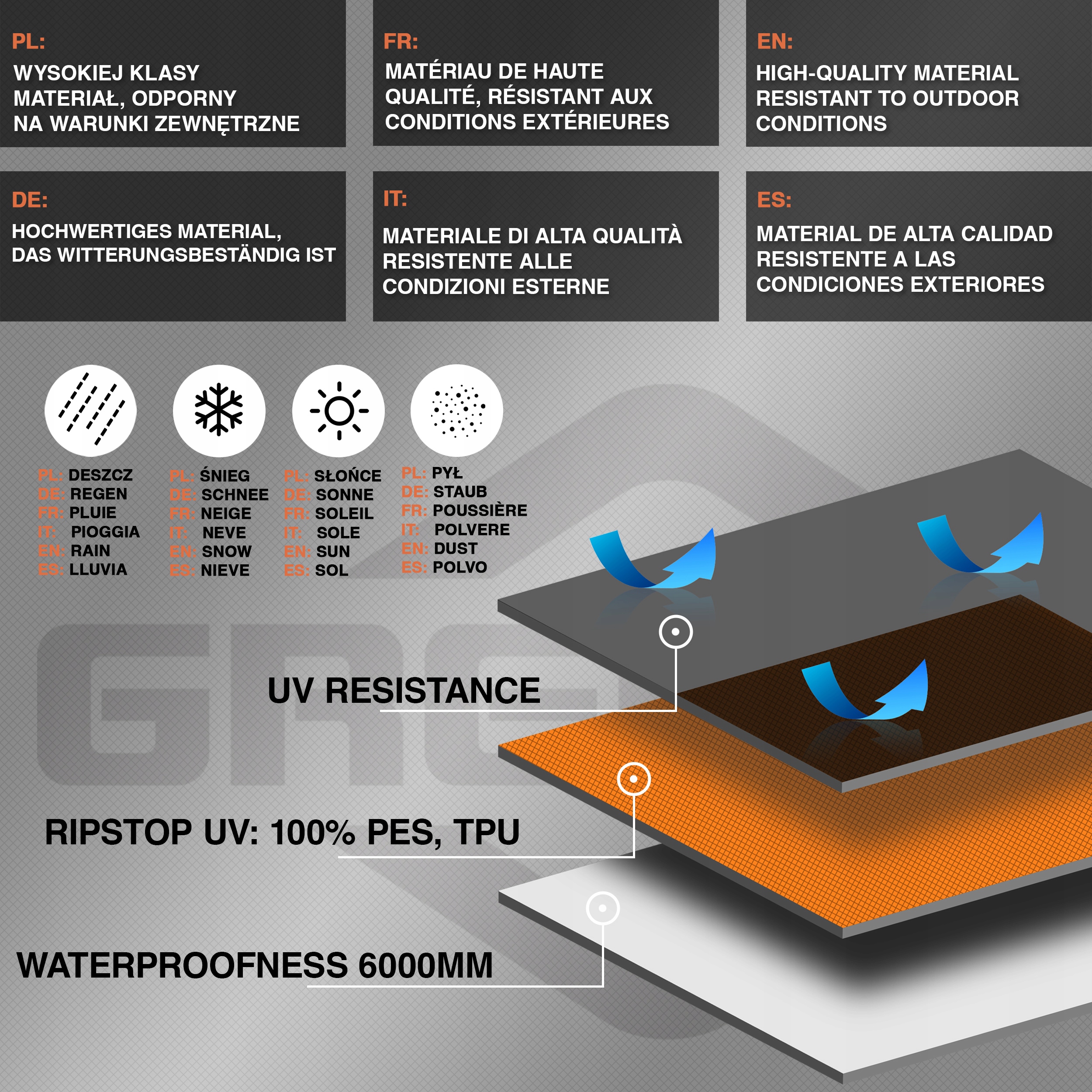 ⭐ ⭐ ⭐tkanina ripstop обладает очень высокой водостойкостью до 6000 мм водного столба по сравнению с другими тканями Оксфорда или Орталиона, где она составляет около 500 мм.