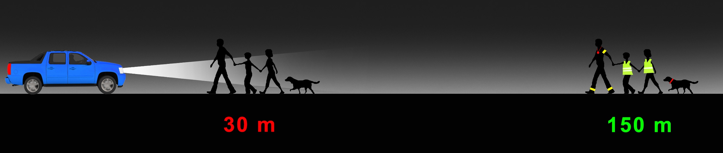После наступления темноты пешехода в темной одежде видно с расстояния примерно 30 метров. Однако человек, носящий светоотражающие элементы, становится видимым даже с расстояния 150 метров. Это определенно снижает риск несчастного случая. Эти дополнительные счетчики позволяют водителю затормозить и безопасно объехать пешехода.