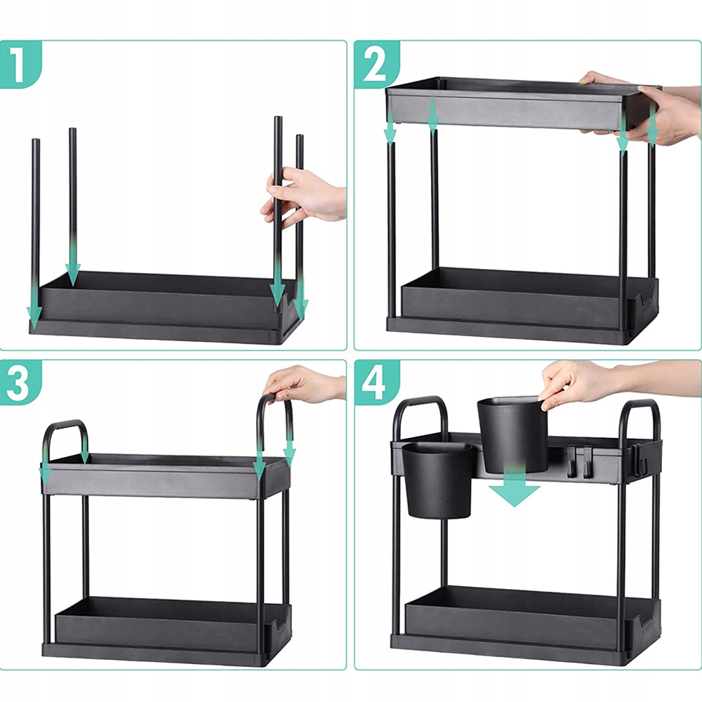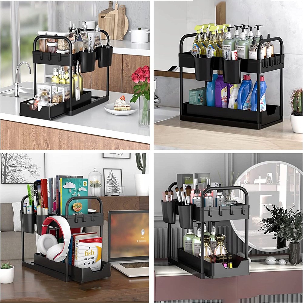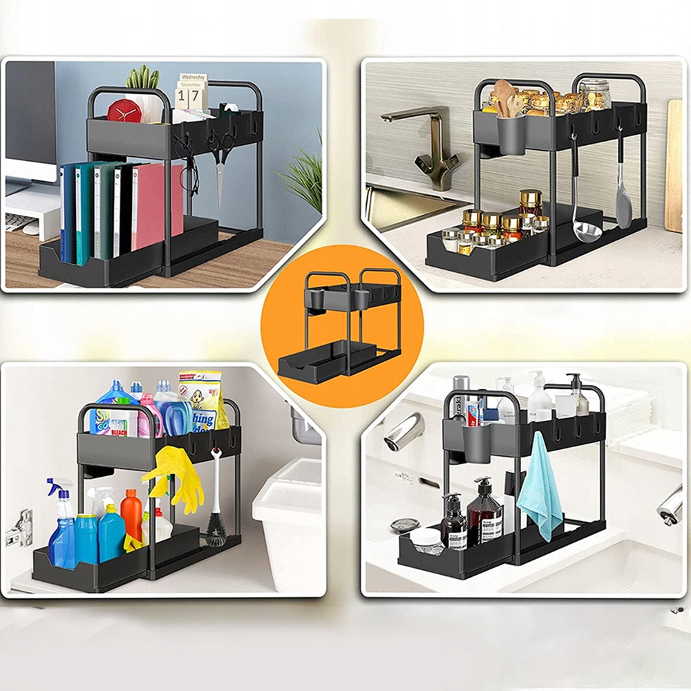 - 🍨 - 【Широкое применение】:Выдвижной органайзер под раковиной подходит для шкафов, кухонь, ванных комнат, кладовых, прачечные, офисы, спальни и многие другие места. Его можно использовать в ванной для хранения геля для душа и шампуня, на кухне для хранения ингредиентов и специй, в туалетном столике для хранения средств по уходу и косметики, кухонного мыла, моющих средств и для хранения детских игрушек. ул>