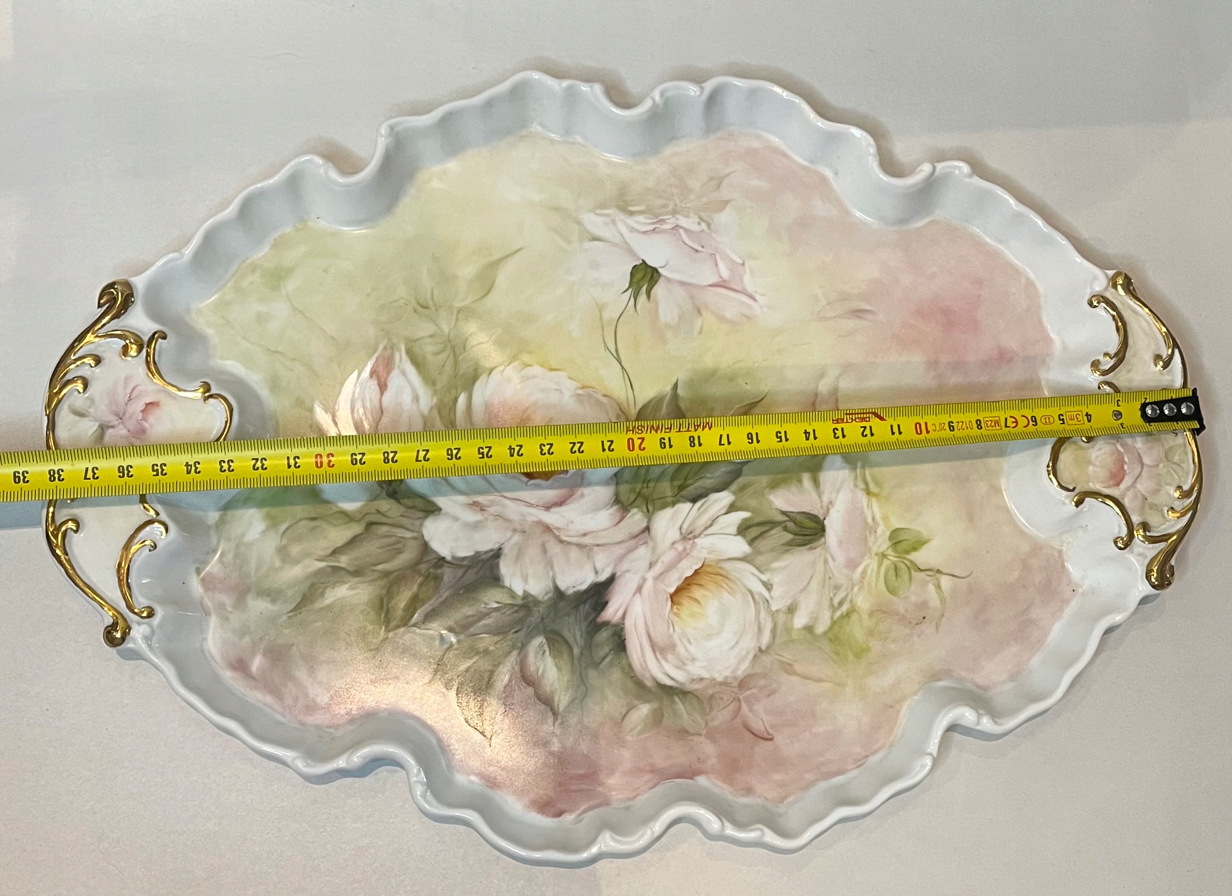 декоративная фарфоровая патера с чрезвычайно большим размером - до 38 × 27 см - это редкая копия, которая привлекает внимание как формой, так и отделкой. Вручную с большим вниманием к деталям, он представляет нежные белые цветы пастельным тоном. Украшен золотистыми ручками причудливой формы. Дополнительным преимуществом является подпись автора живописи , которая увеличивает ценность коллекционера патеры.