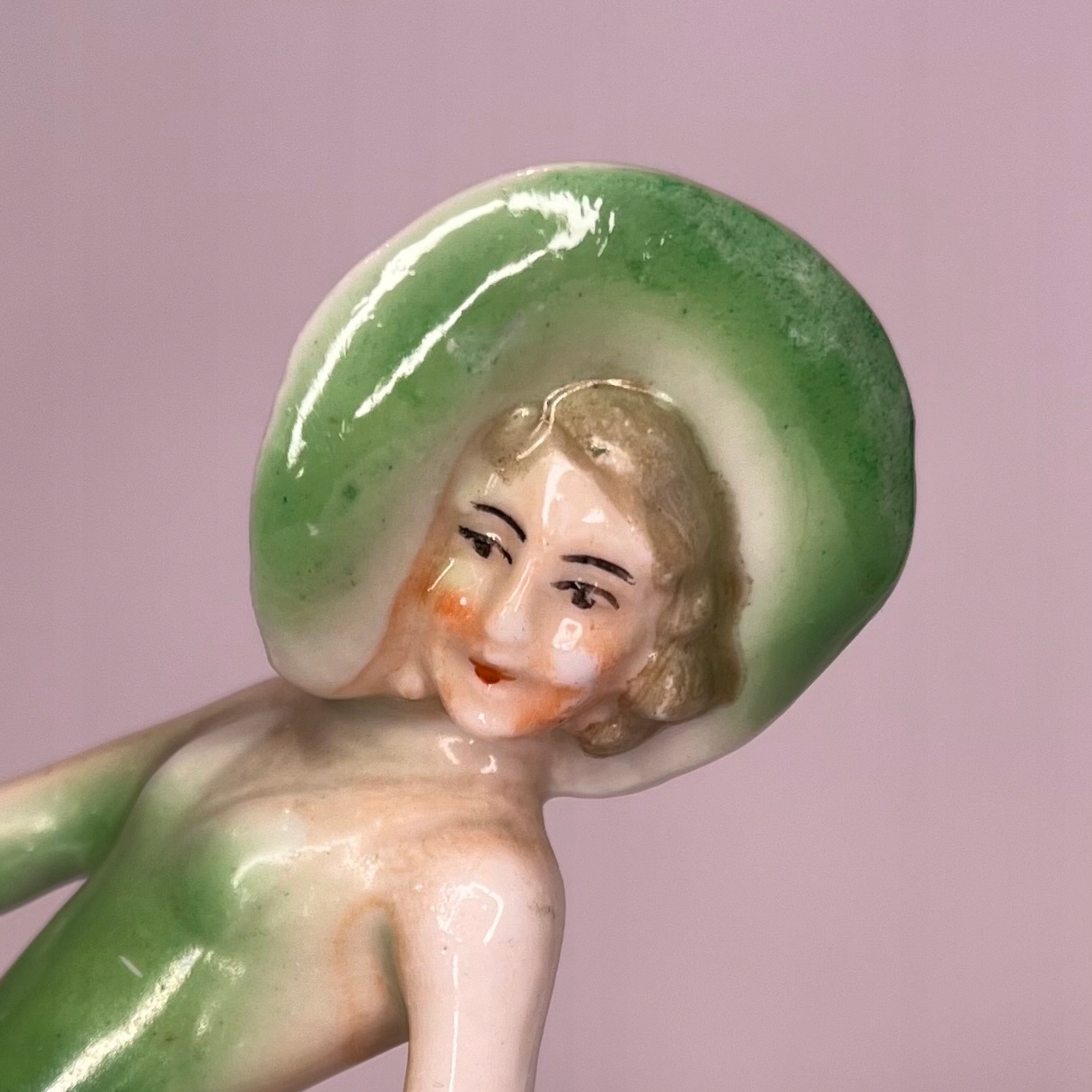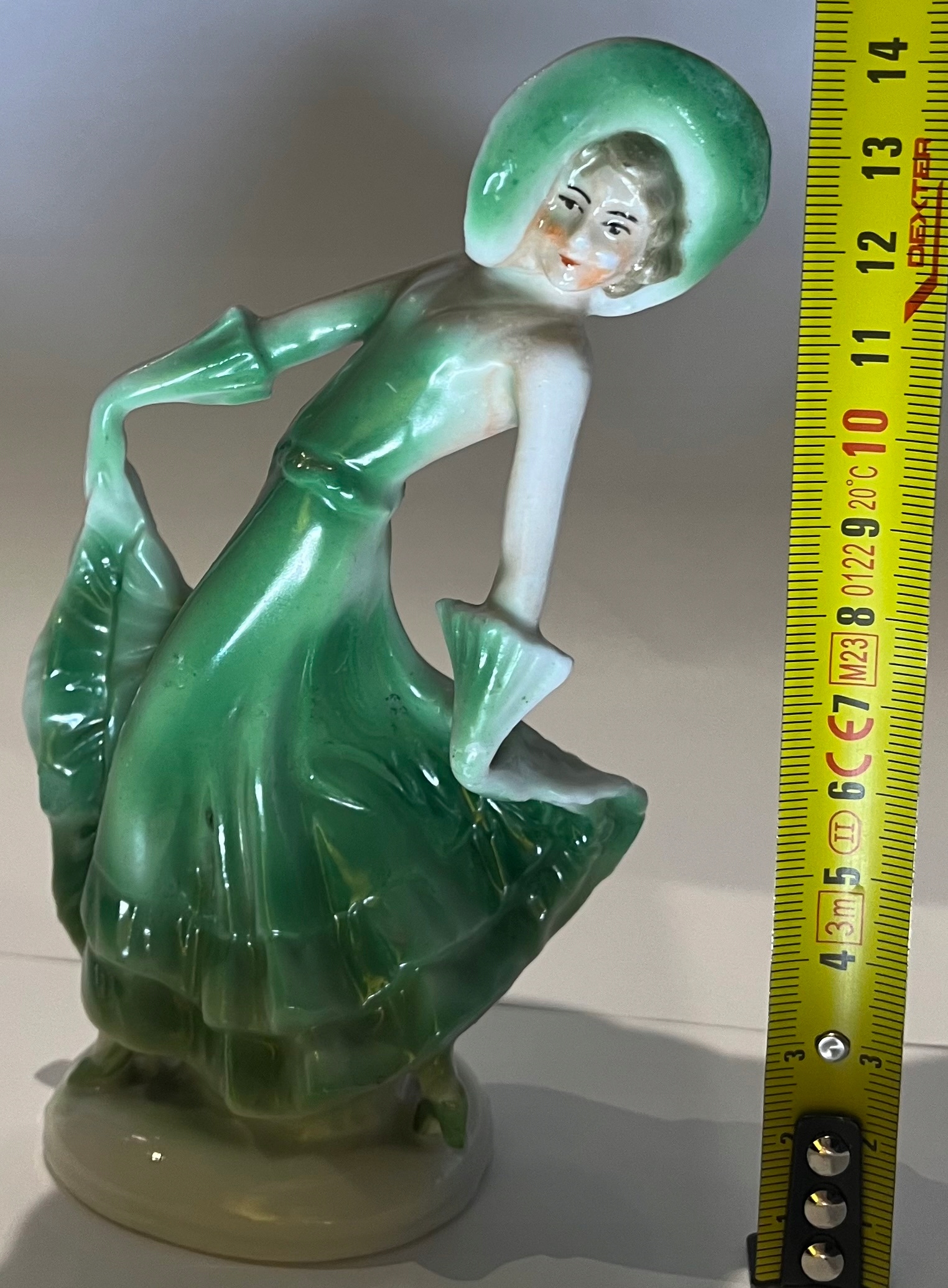 Фарфоровая фигурная танцовщица в зеленом платье и шляпе