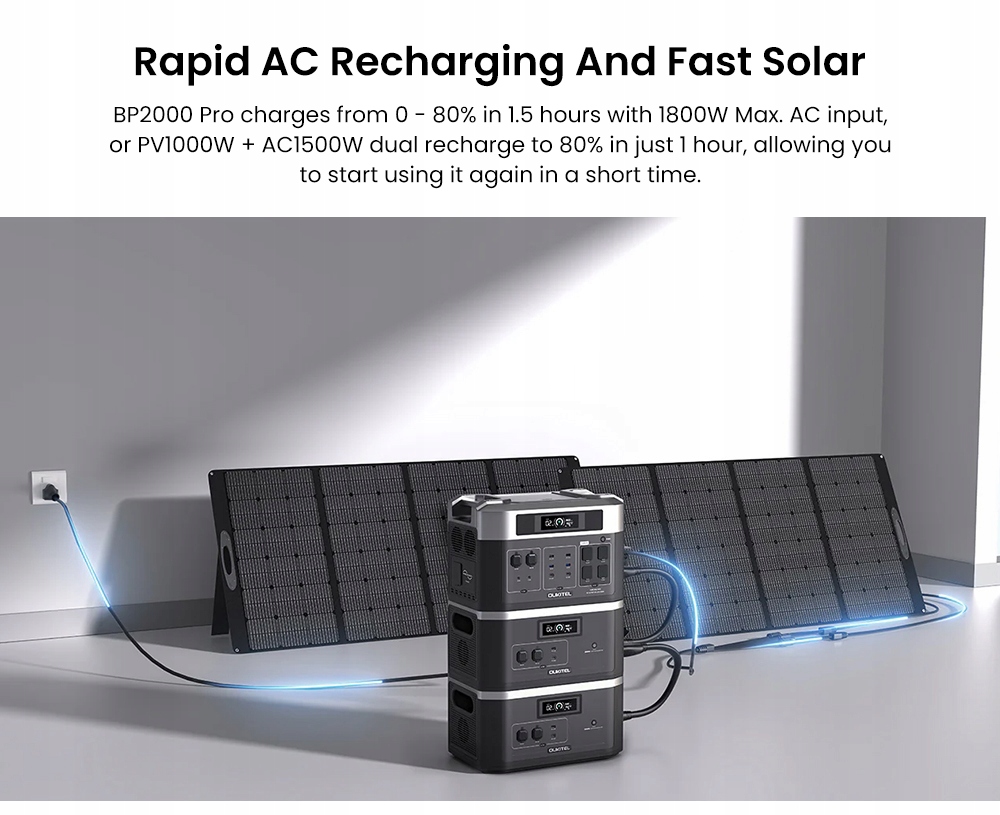 ✅Быстрая зарядка от переменного тока и быстрая зарядка от солнечной батареи: BP2000 Pro заряжается от 0% до 80% за 1,5 часа при выходной мощности переменного тока 1800 Вт. Альтернативно вы можете использовать блок питания PV1000W + AC1500W, чтобы бесплатно получить 80% ресурсов за 1 час.