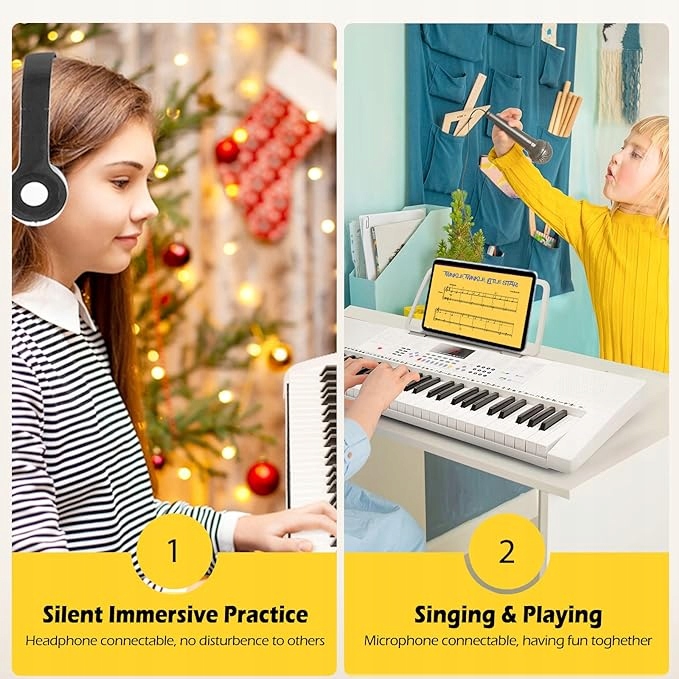 - Изучение фортепианной клавиатуры. Адаптированный размер клавиш для начинающих, изучение функций клавиатуры фортепиано с огромной звуковой библиотекой, содержащей до 600 тембров и ритмов, 50 демонстрационных песен и 61 ударный инструмент, позволяют детям легко узнавать различные музыкальные инструменты. вы сможете раскрыть свой творческий потенциал и насладиться выступлениями группы.