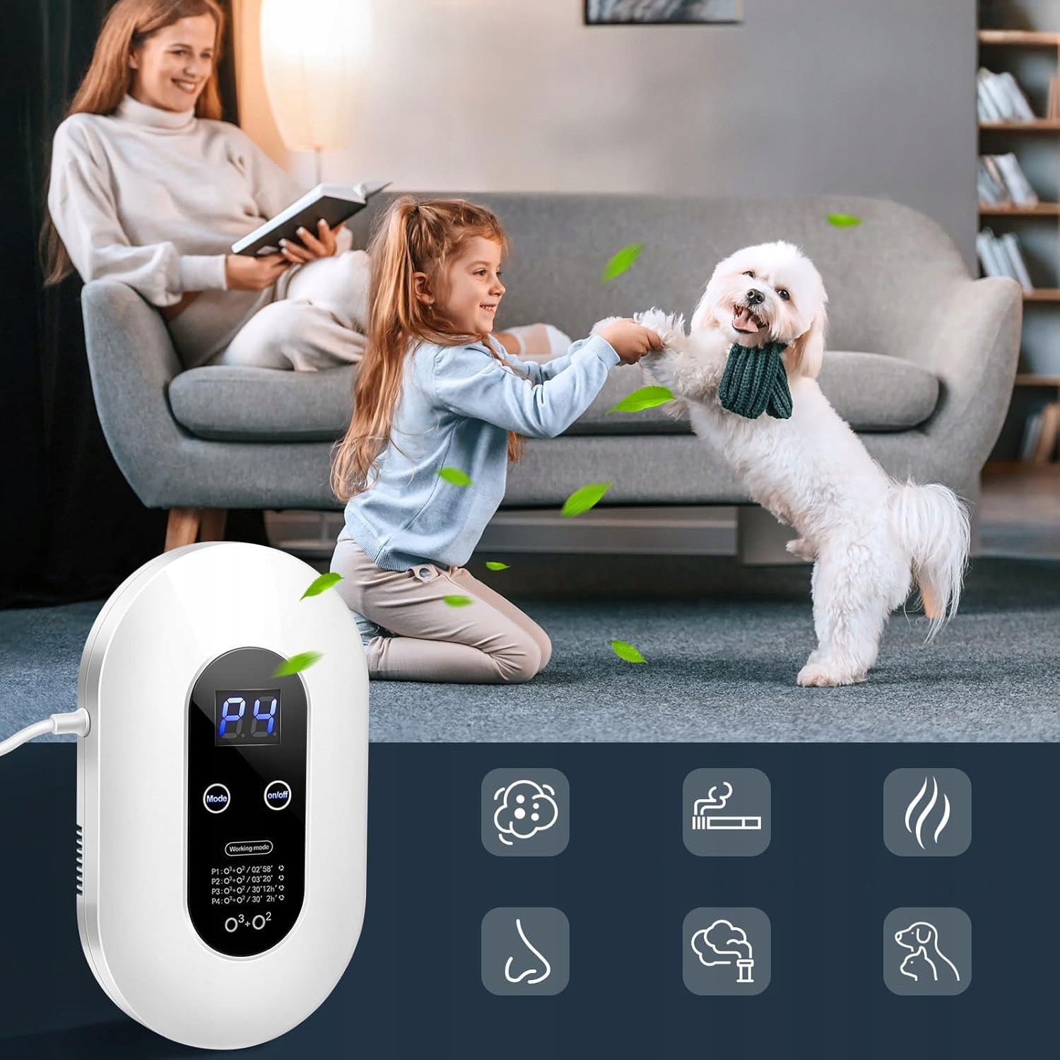 Устройство высвобождает озон, обеспечивая эффективную очистку. Люди и домашние животные должны временно покинуть комнату во время использования, а после вентиляции они могут вернуться к миру. Чувствительные люди или семьи с домашними животными могут должным образом сократить время использования в одно время.