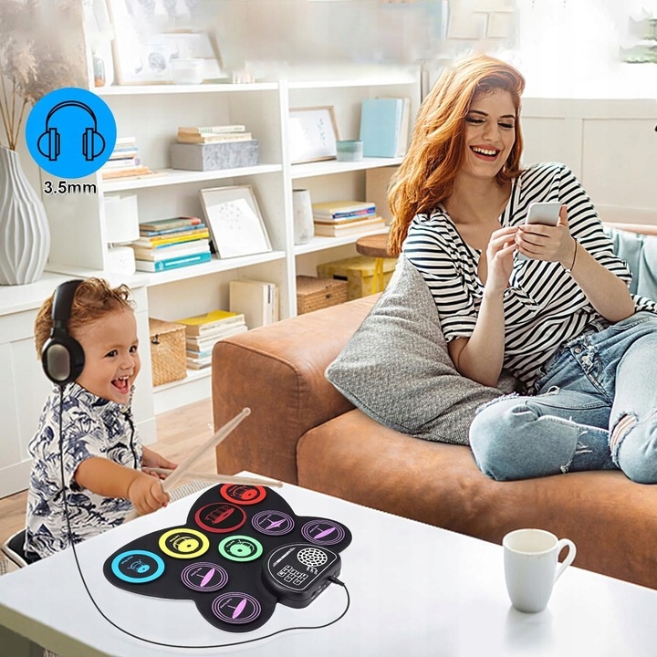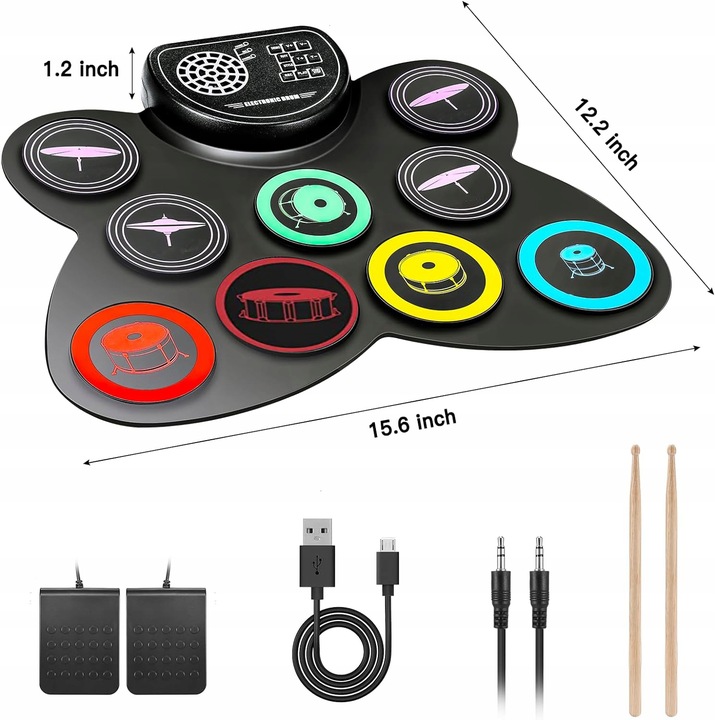 -электронный барабан с 9 реалистичными барабанами: 3 объема, 2 аварийных пластин, 1 Hi -Hat, 1 Ride Plate, 1 малый барабан и 1 бас -барабан. потребности.