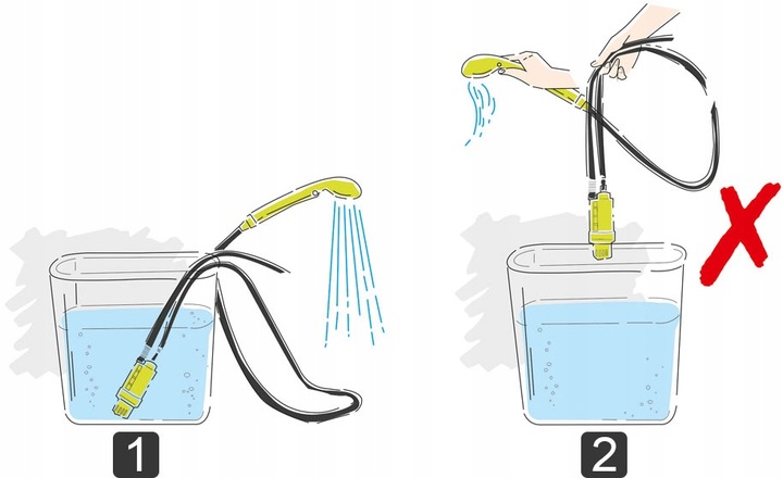 2⃣ душ следует запустить после вставки насоса в резервуар с водой , «сухой» работа может повредить насос. Это также относится к работе после того, как положил насос в воду.