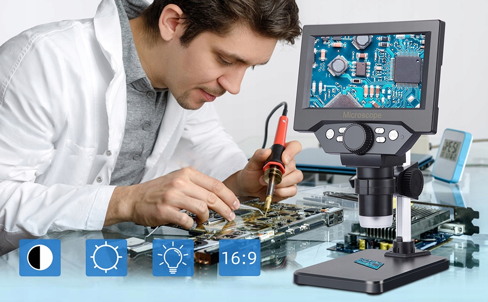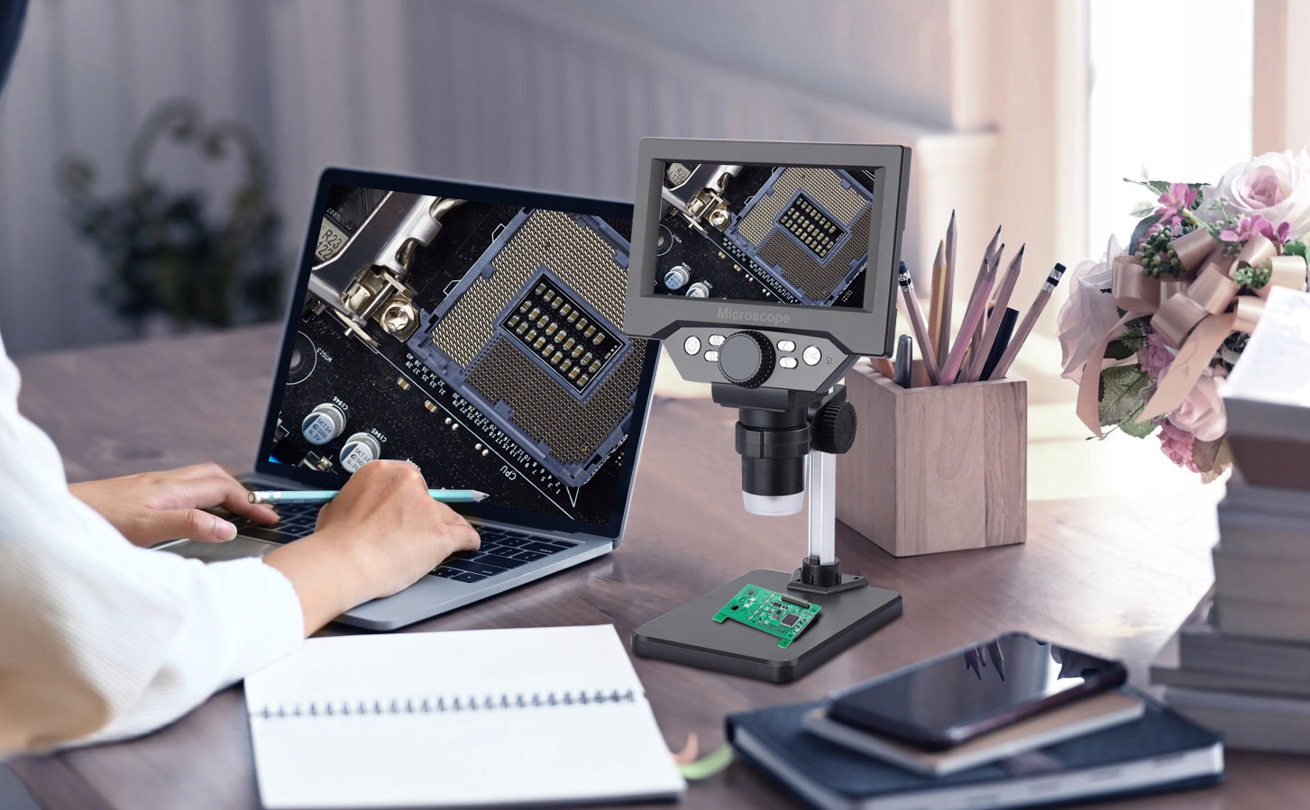 Этот электронный микроскоп имеет встроенный 5,5-дюймовый экран для прямого просмотра, что делает его очень удобным для использования снаружи.