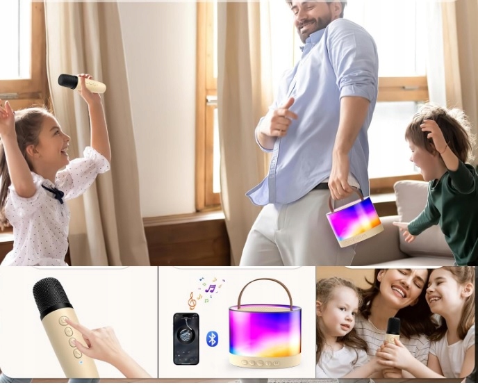 Караоке -динамик использует качество звука Hifi, глубокого баса и пространственного 3D -стерео, что может обеспечить текстуру музыки более реалистично, благодаря какой музыке течет лучше. Он оснащен микрофоном с высоким разрешением, который может работать настоящим голосом, сводя к минимуму шум окружающей среды, благодаря которому голос всегда правильный и чистый. "