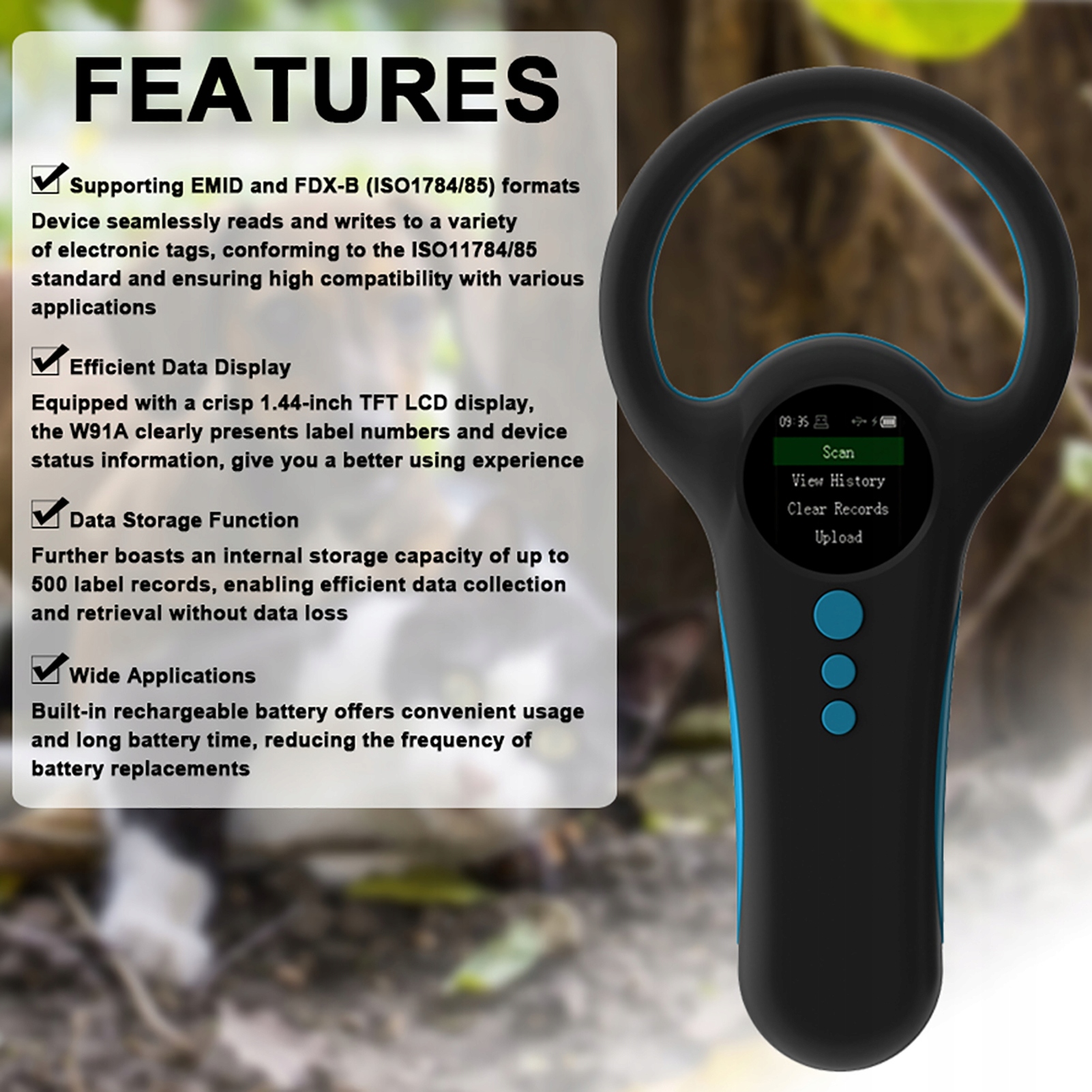 2. 【Универсальная совместимость метки】: Сканировать быстро и эффективно, экономия время и усилия. Поддерживая форматы EMID и FDX-B (ISO1784/85), это устройство считывает и сохраняет различные электронные теги, в соответствии с стандартом ISO11784/85 и обеспечивая высокую совместимость с различными приложениями.