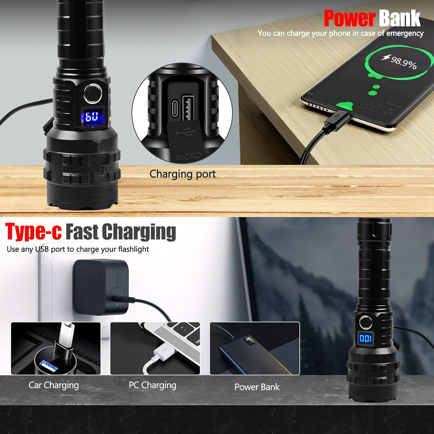✅ Фонарик через порт USB-C, можно заряжать от автомобильного зарядного устройства, компьютера, блока питания, настенного зарядного устройства USB и т. д.
