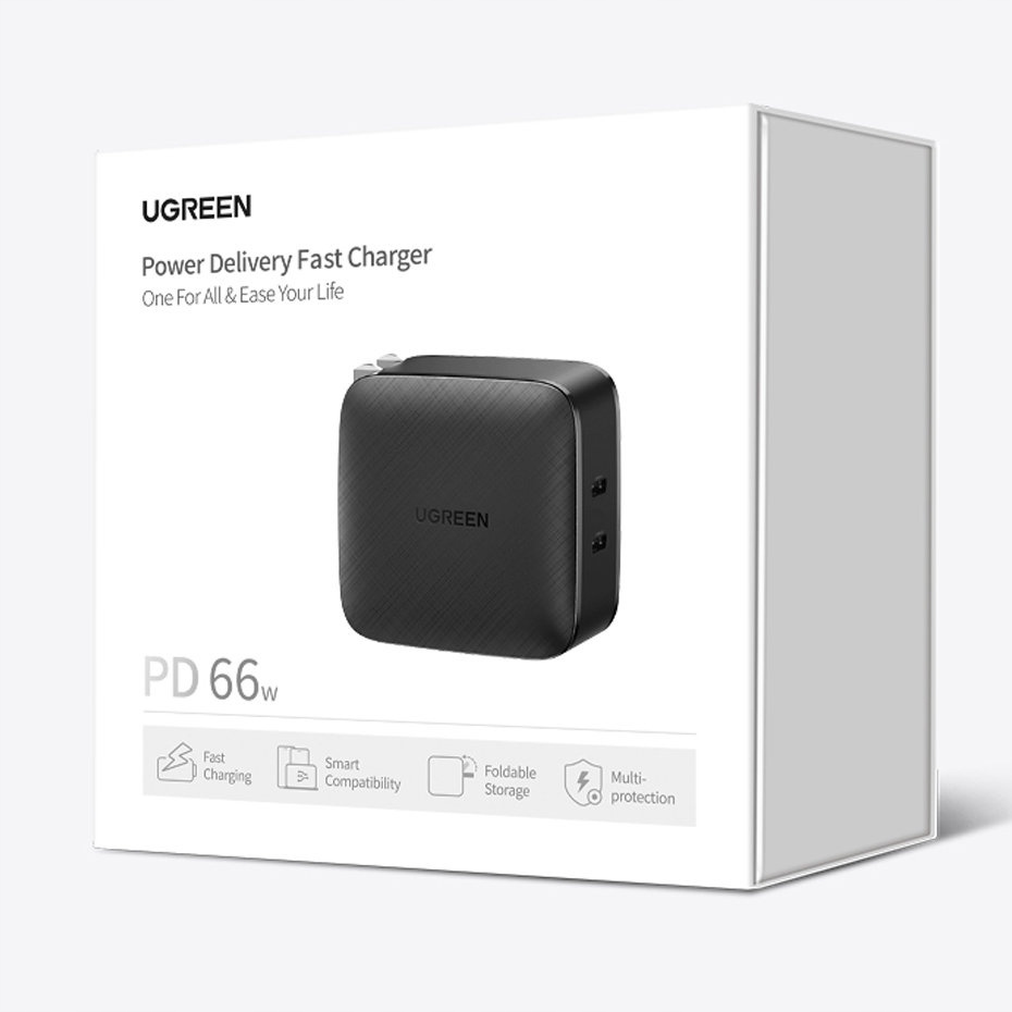 Зарядное устройство Ugreen CD216 имеет два порта USB Type C, которые могут обеспечивать мощность до 66 Вт. Важно отметить, что встроенная интегральная схема интеллектуально настраивает параметры зарядки в зависимости от подключенного устройства. устройства. Если вы заряжаете только ноутбук, зарядное устройство будет работать на мощности 66 Вт. Если вы хотите заряжать ноутбук и смартфон одновременно, оно разделит энергию 45 Вт + 20 Вт.