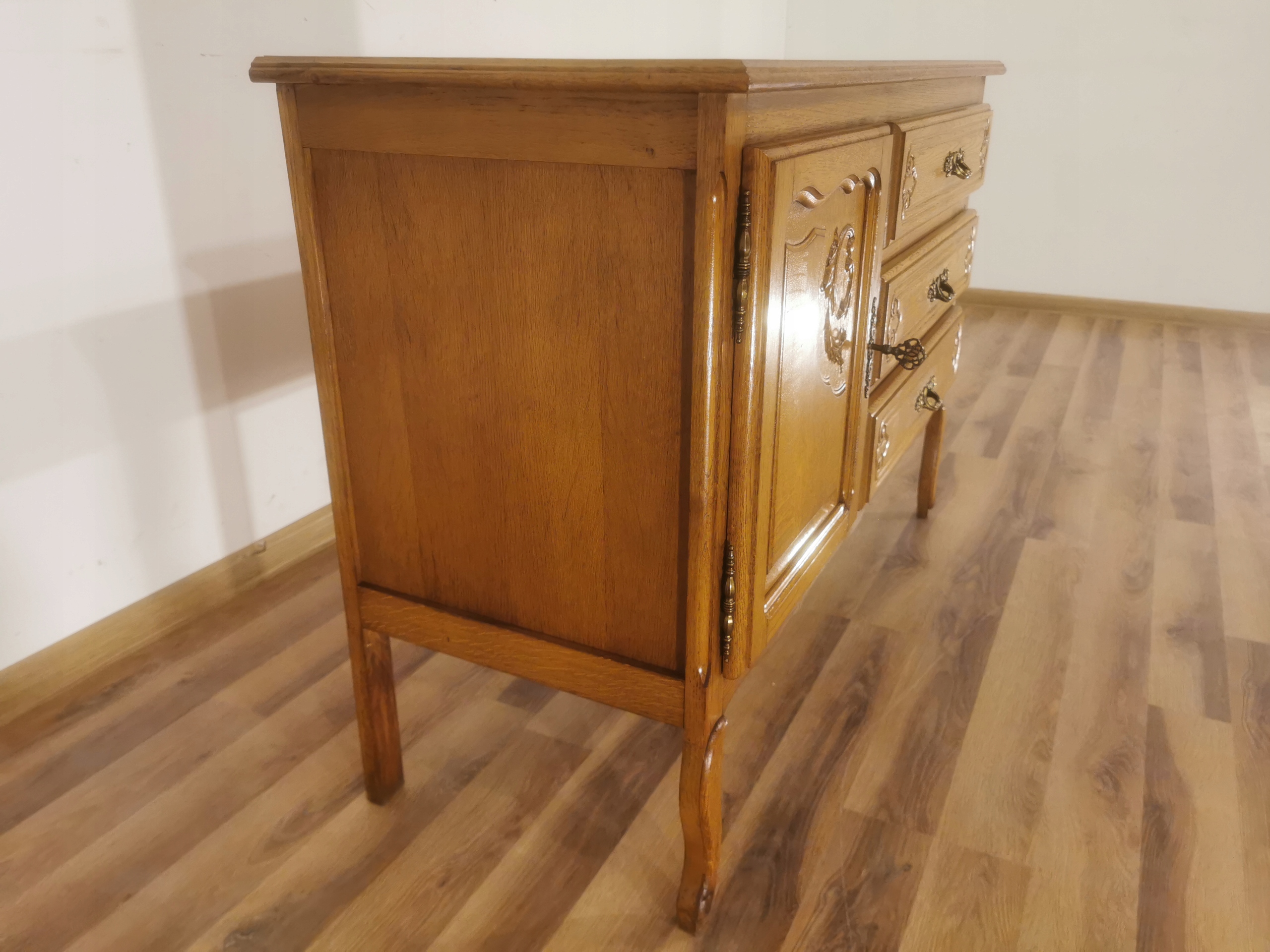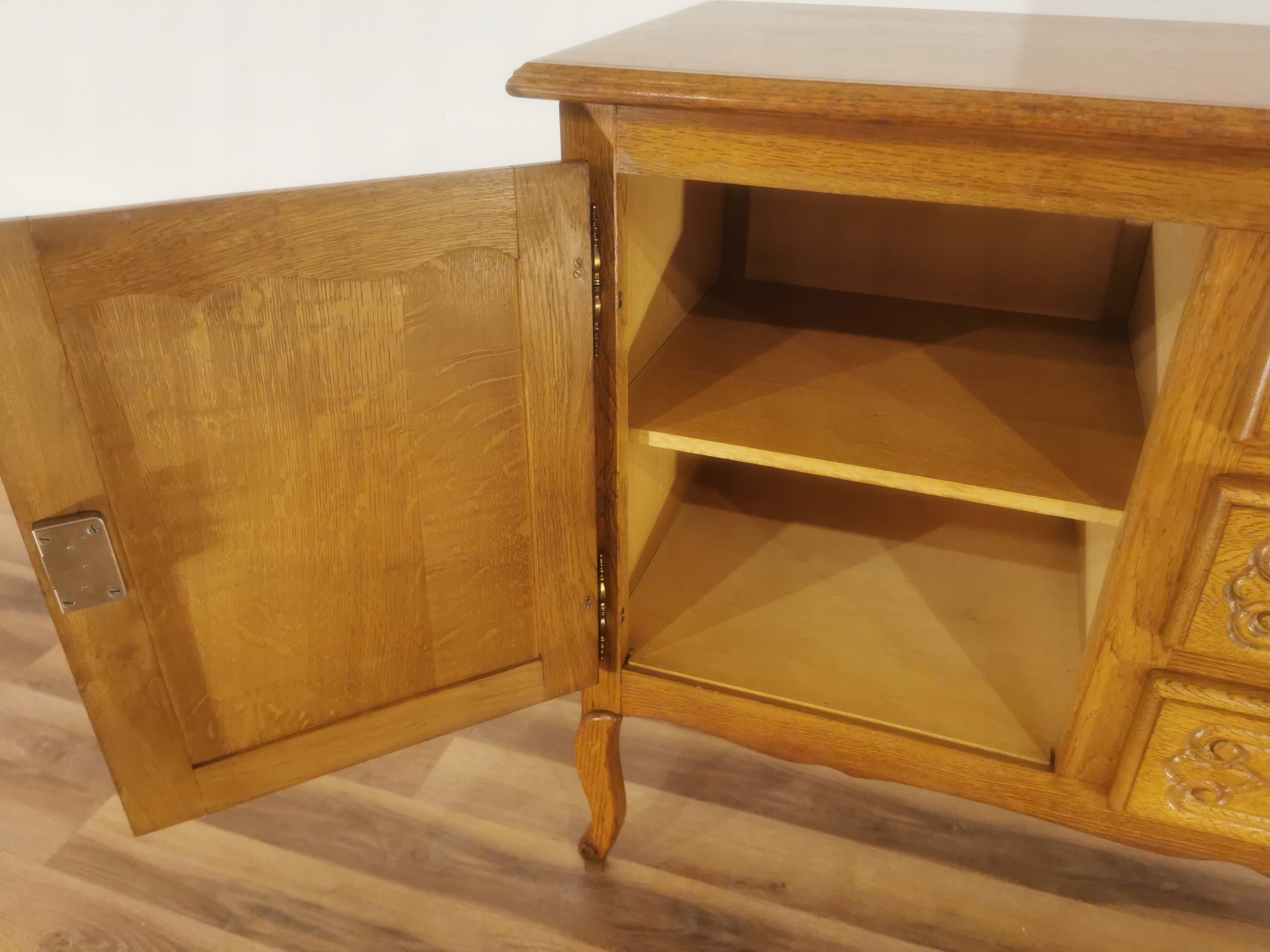 спереди, край столешницы и комод с ногами из твердого дуба. Середина столешницы от MDF, украшенная дубовым шпоном. Наполнительные боковые стены из фанеры, покрытой шпоном.