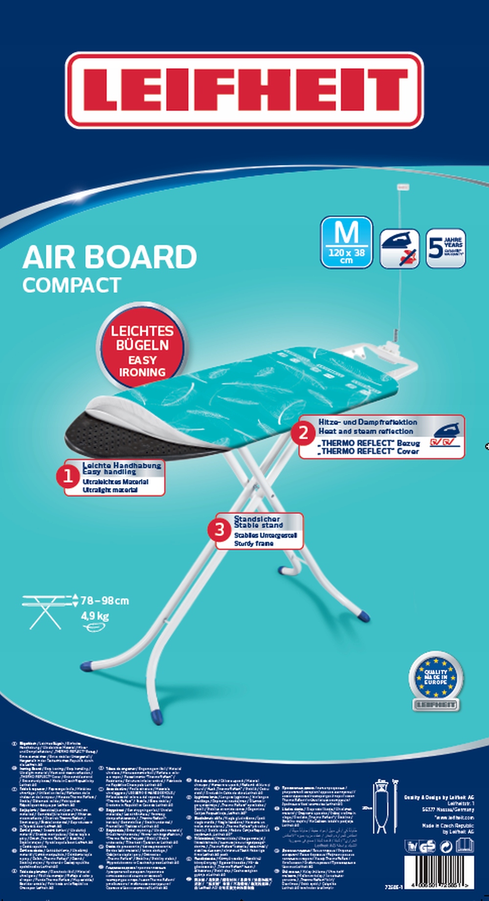 ⭐Столешница оснащена покрытием Thermo Reflect, которое отражает пар и тепло утюга, а не передает его через столешницу. Также отлично подходит для паровых утюгов. Leifheit рекомендует доски серии Air Board Express для паровых станций.