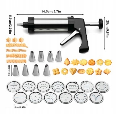 - Эргономическая конструкция - Пресс для выпекания хорошо подходит в вашей руке, просто положите тесто в трубку, нанесите желаемую форму/сопло и сжимайте. Удалены, и все детали подходят для мытья в посудомоечной машине. ul>