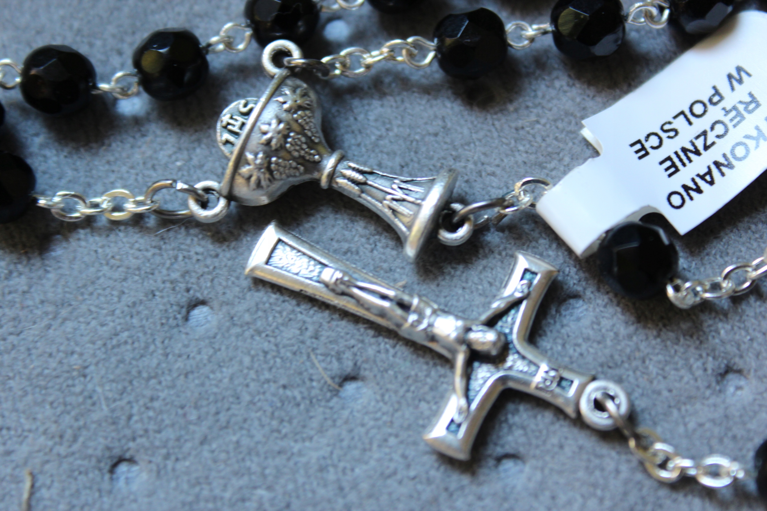 Красивые четки ручной работы из черных кристаллов с чашей IHS и крестом Фатимы.