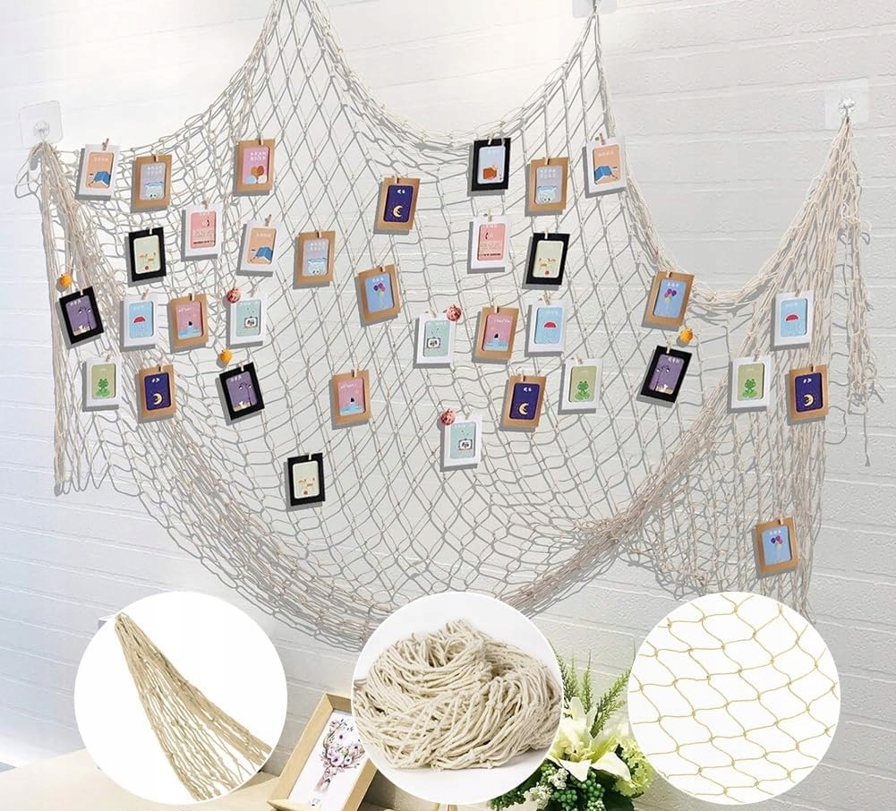 - прибрежная атмосфера: Рыбацкая сеть с прикрепленными раковинами вносит в атмосферу морских экспедиций, идеально подходящая для создания расслабляющего климата.