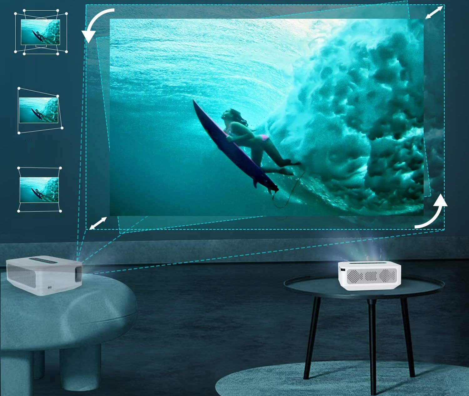 ⭕ Проецируете изображение на разные поверхности? Не беспокойтесь! Проектор имеет автоматическую коррекцию трапецеидальных искажений в диапазоне +/- 45 градусов. Благодаря этому вы получаете идеально центрированное и пропорциональное изображение. Независимо от угла. Нет искажений. Просто идеально!